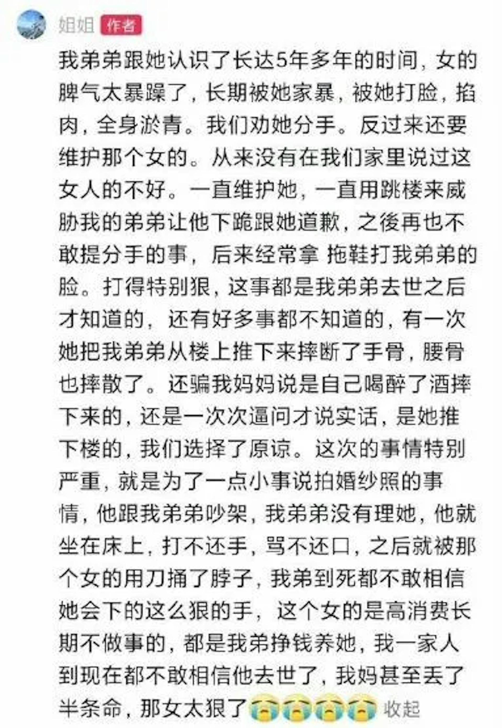 * R& P$ F7 s# K+ J5 u6 ~4 j公仔箱論壇疑死者親姊上網控訴其弟長期遭女友家暴。(微博)