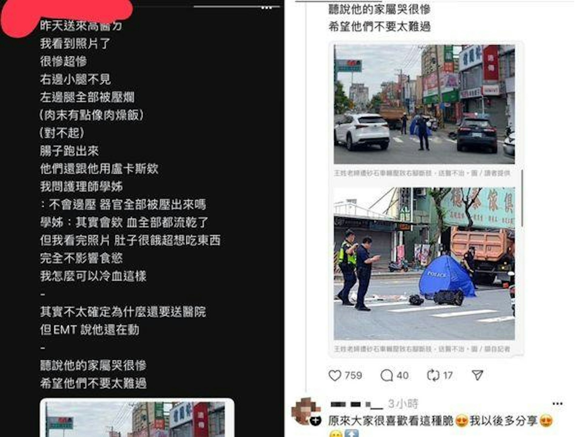 & e" |4 p: u4 c8 e. b台灣高雄市本月1日發生砂石車撞擊電動輔助車事故,導致一名婦人捲入車底遭輾,送往高雄醫學大學附設中和紀念醫院(高醫)搶救後仍不治。然而,事後驚傳院內工讀生在社群平台Threads上發文,指老婦人「左邊腿全部被壓爛,肉末有點像肉燥飯」,貼文一出引台灣輿論譁然。目前院方已對該名工讀生暫時停職,並發表聲明向死者家屬、社會大眾致歉。TVBNOW 含有熱門話題,最新最快電視,軟體,遊戲,電影,動漫及日常生活及興趣交流等資訊。2 @, }! t. Q5 D! V& s) L