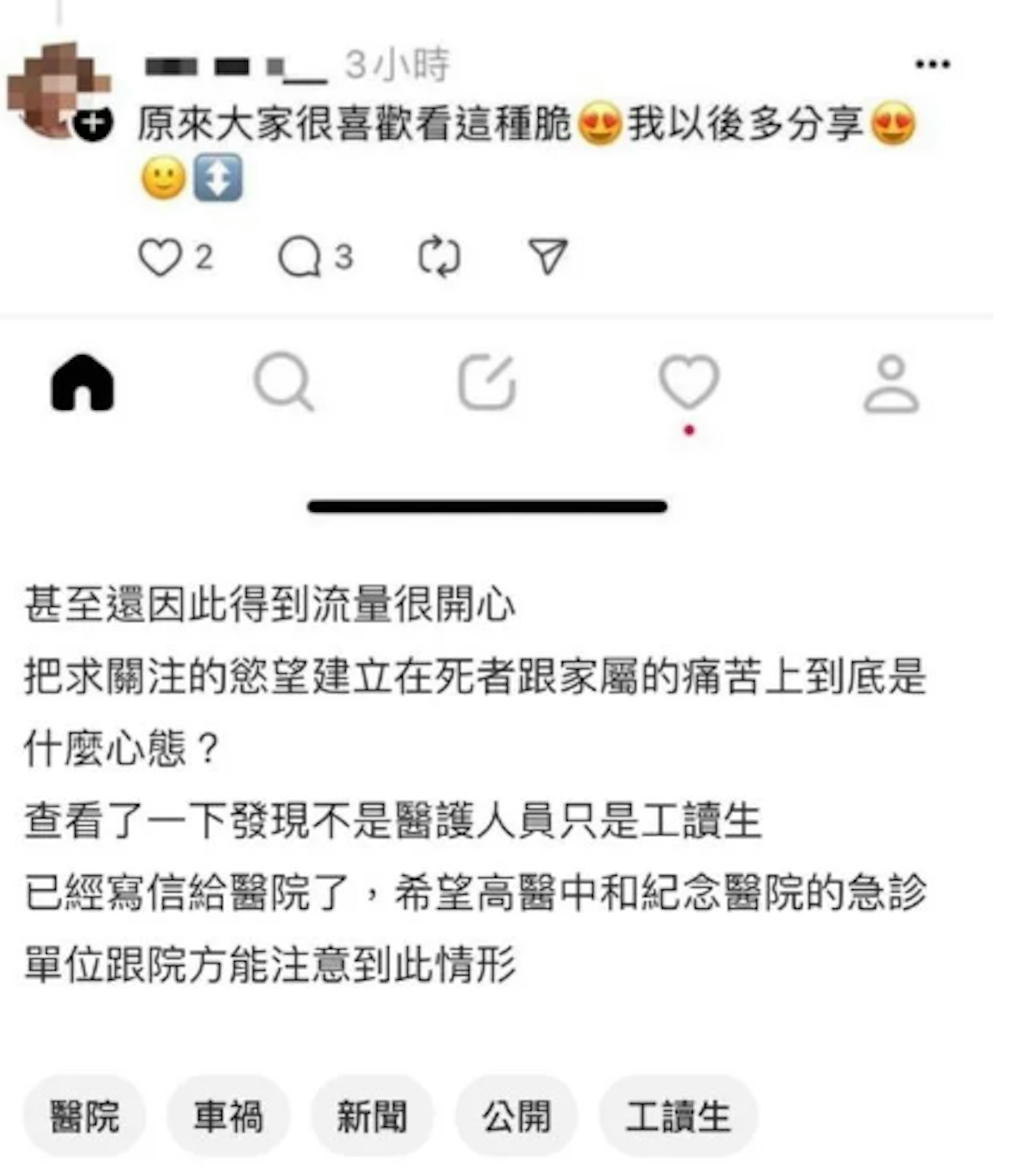事件起因為一名高醫急診工讀生在Threads上分享車禍新聞的照片,發文指出,這名傷者被送往高醫,看到傷況照片非常慘,「右邊小腿不見,左邊腿全部被壓爛,肉末有點像肉燥飯,對不起,腸子跑出來,他們還跟他用盧卡斯(自動CPR機器)欸」。公仔箱論壇 z4 e( R. [* r