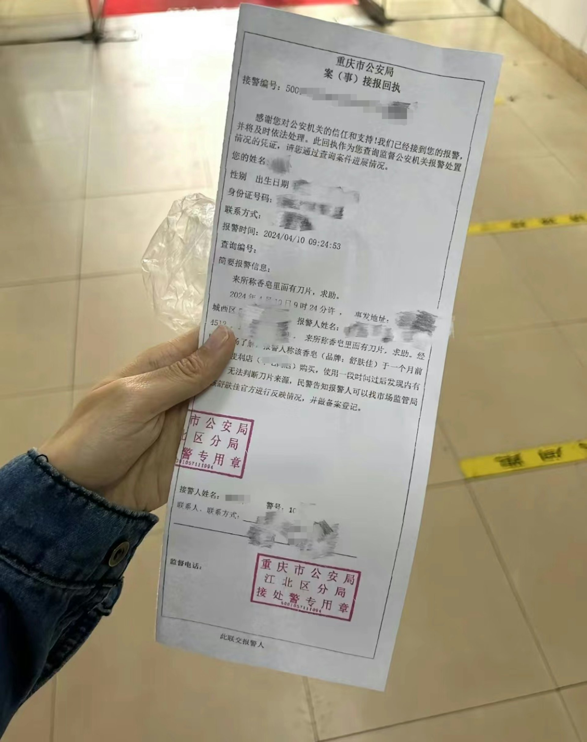 接報回執上的報警信息中顯示,「報警人稱該香皂於一個月前在便利店購買,使用一段時間過後發現內有刀片,無法判斷刀片來源,民警告知報警人可以找市場監管局……舒膚佳官方進行反映情況,並做備案登記」。