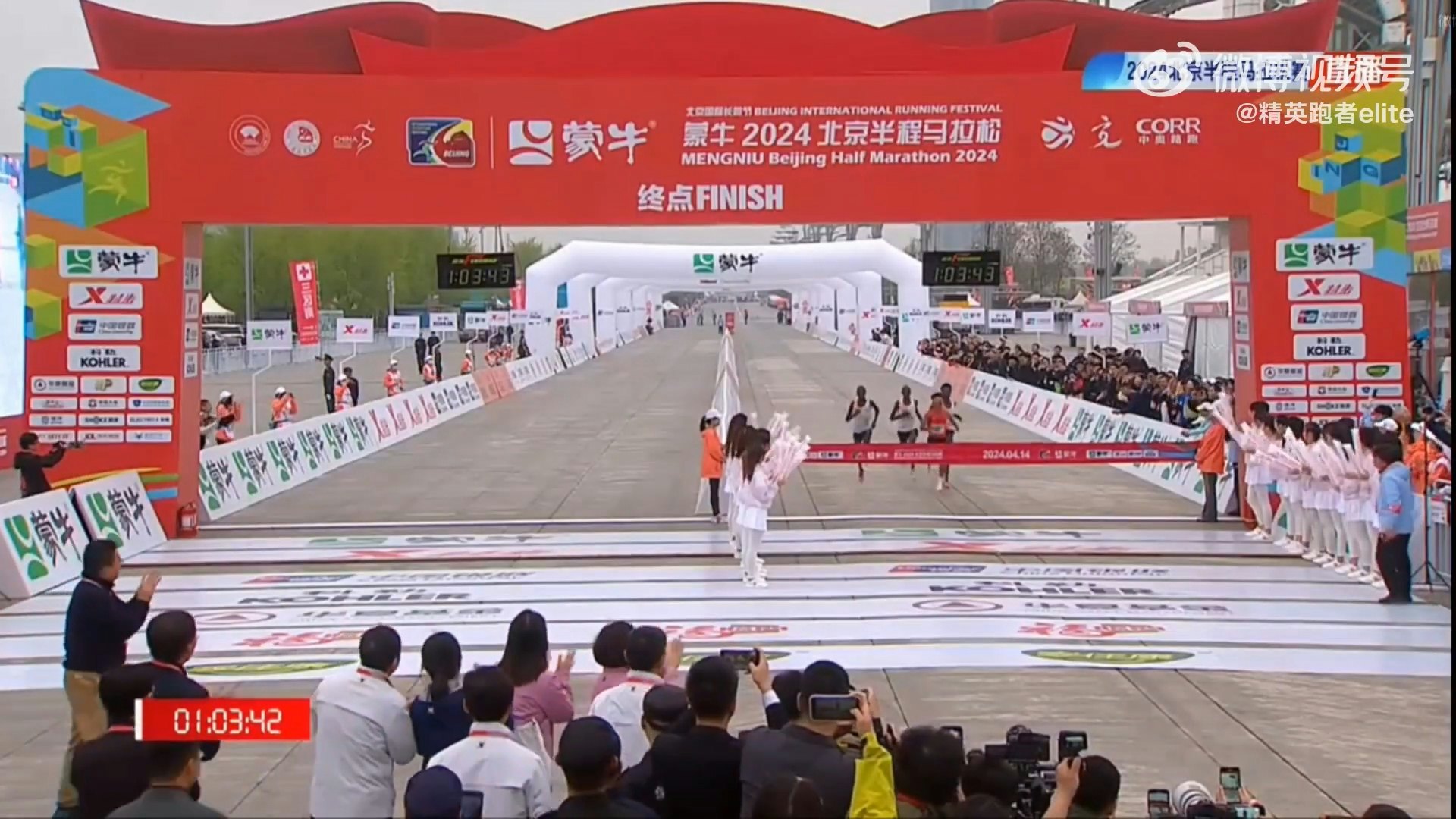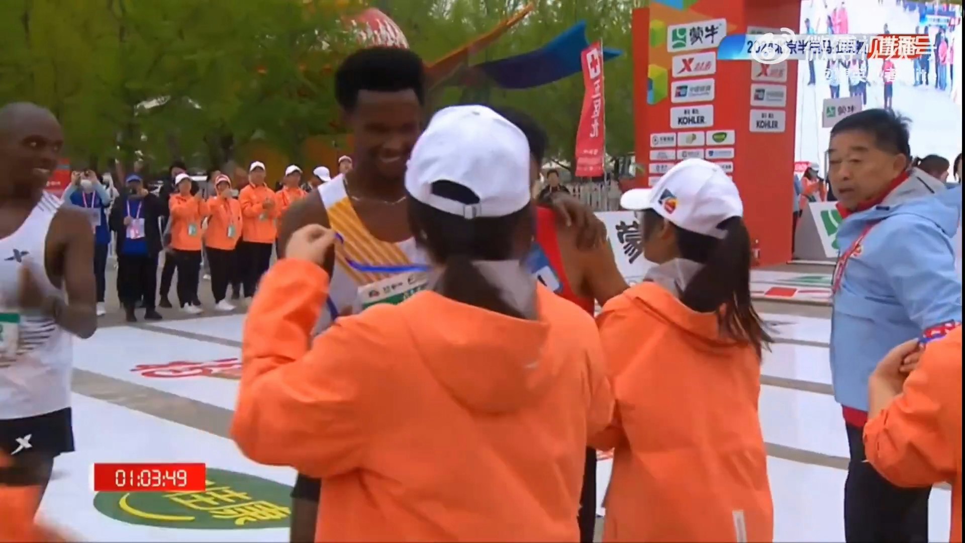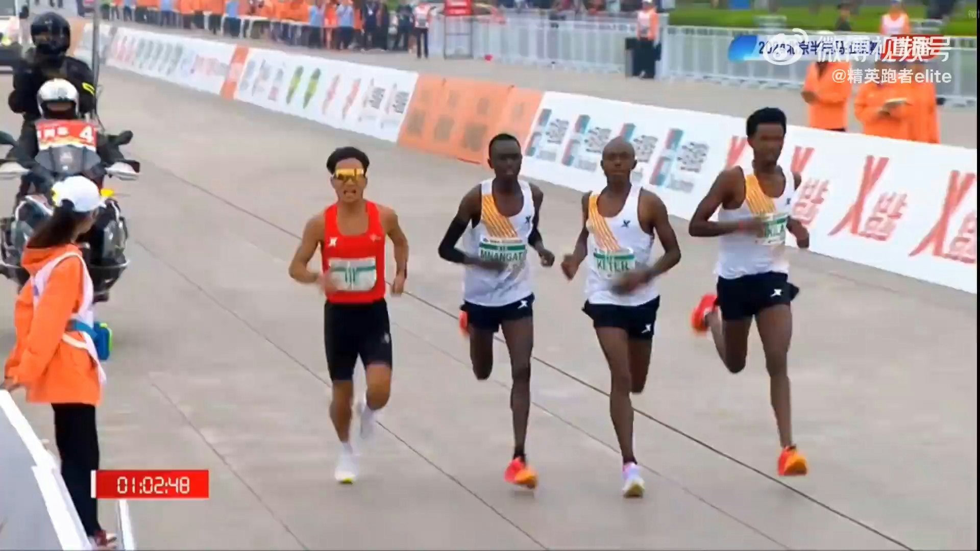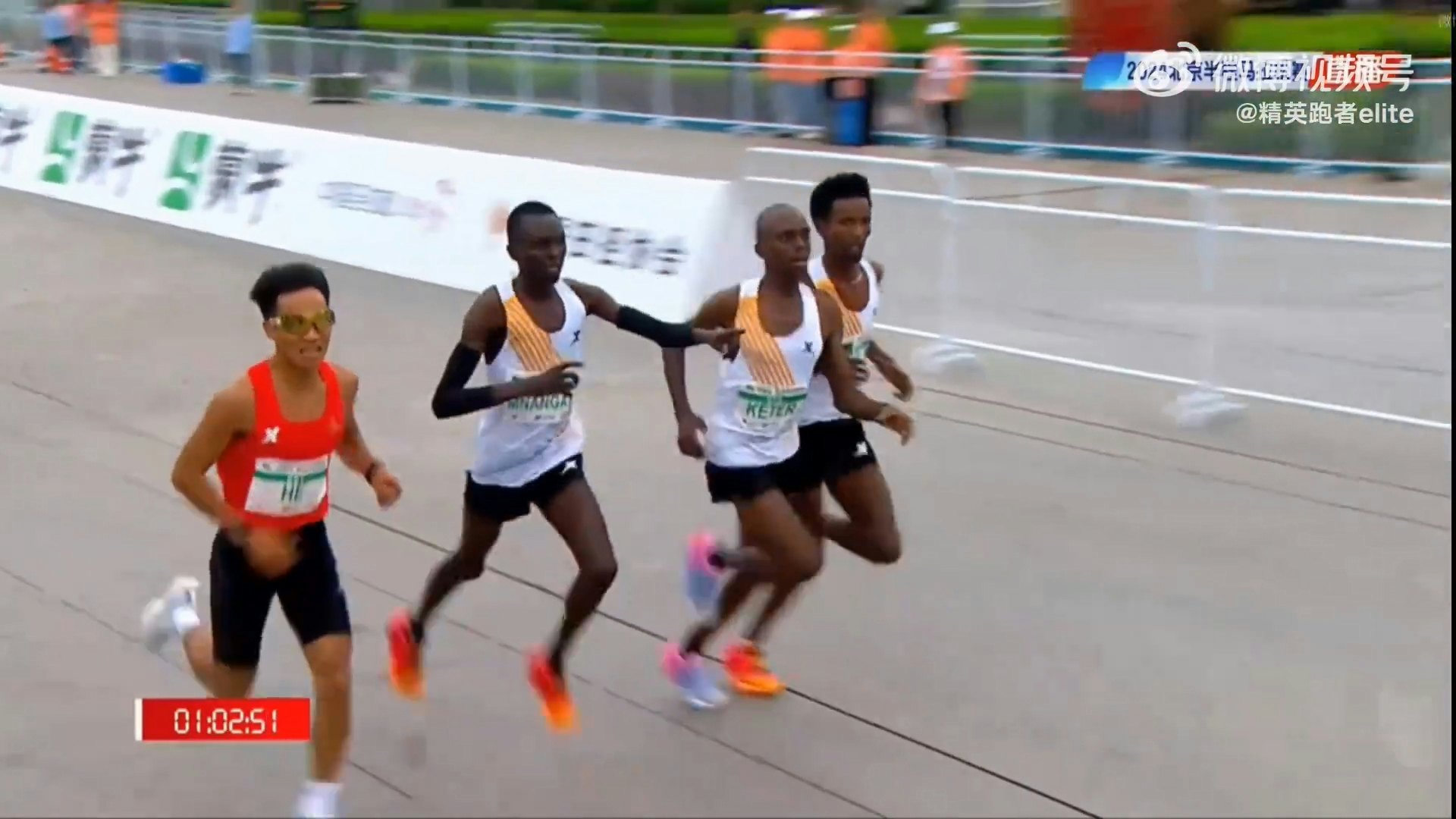 最終何杰率先衝過終點線,累得彎下腰來,而3位非洲跑手則並排同行,不快不慢地緊隨他身後衝線,三人均神色輕鬆、滿面笑容地向何杰道賀,幾乎沒有氣喘。