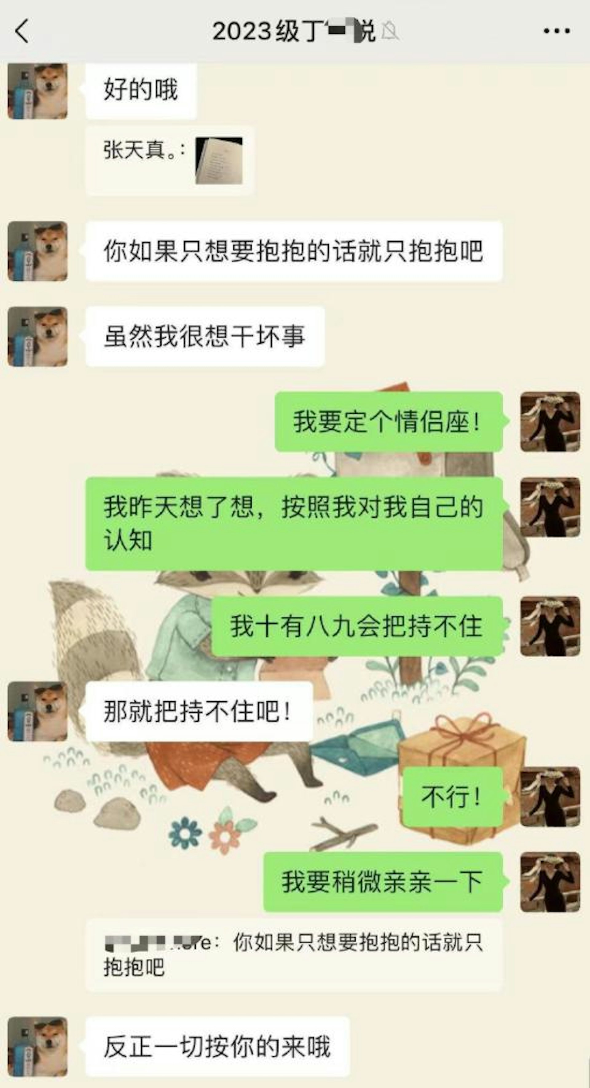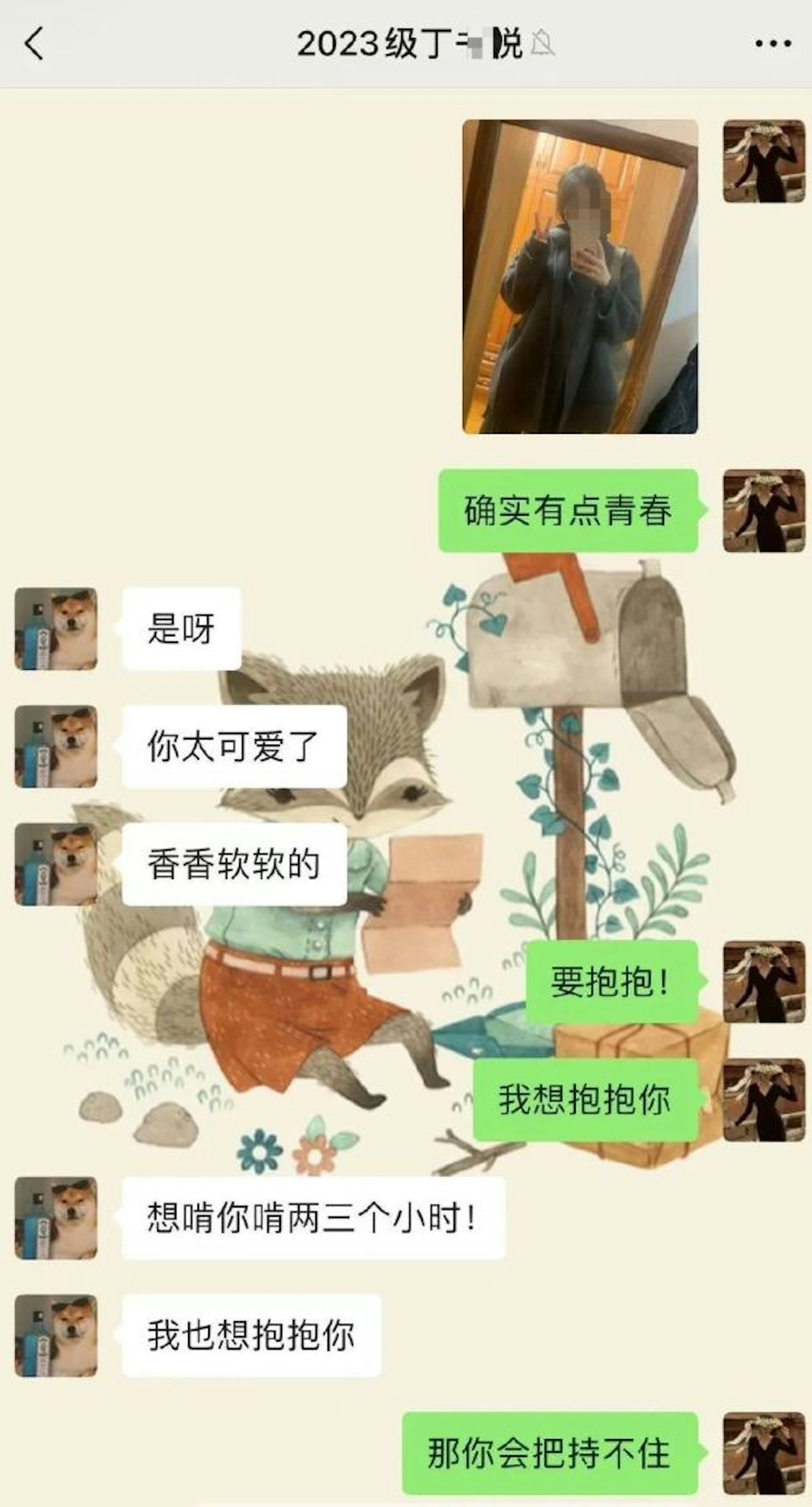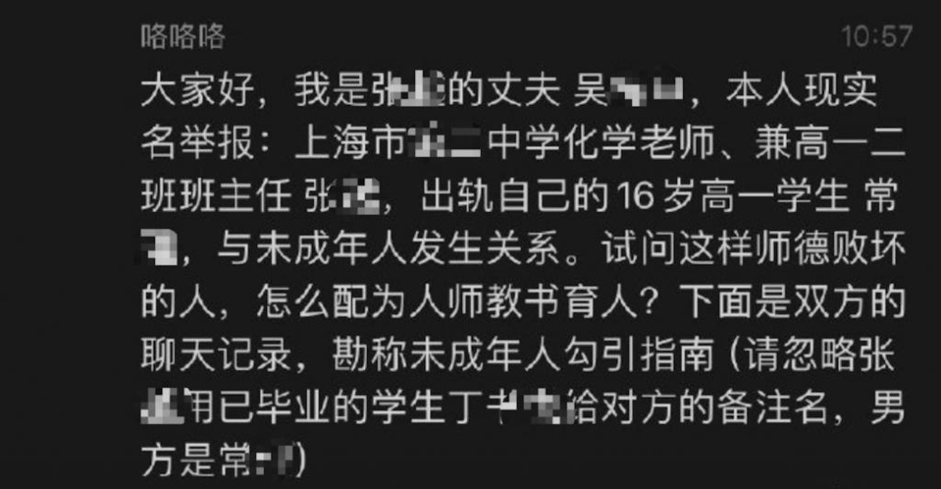 報道指,網友發布的消息顯示,2月16日上午,自稱為上海市徐匯區某中學化學老師兼高一班主任丈夫的微信用戶,實名轉發公開了多張他的張姓妻子與其16歲高一男學生的微信聊天截圖,斥責妻子「出軌」、「與未成年人發生關係」,「試問這樣師德敗壞的人,怎麼配為人師教書育人?」更嘲諷兩人對話堪稱「未成年勾引指南」。此事在貼吧等平台發酵後,於2月18日登上微博熱搜,引發高度關注。, P3 i& Y1 `# f