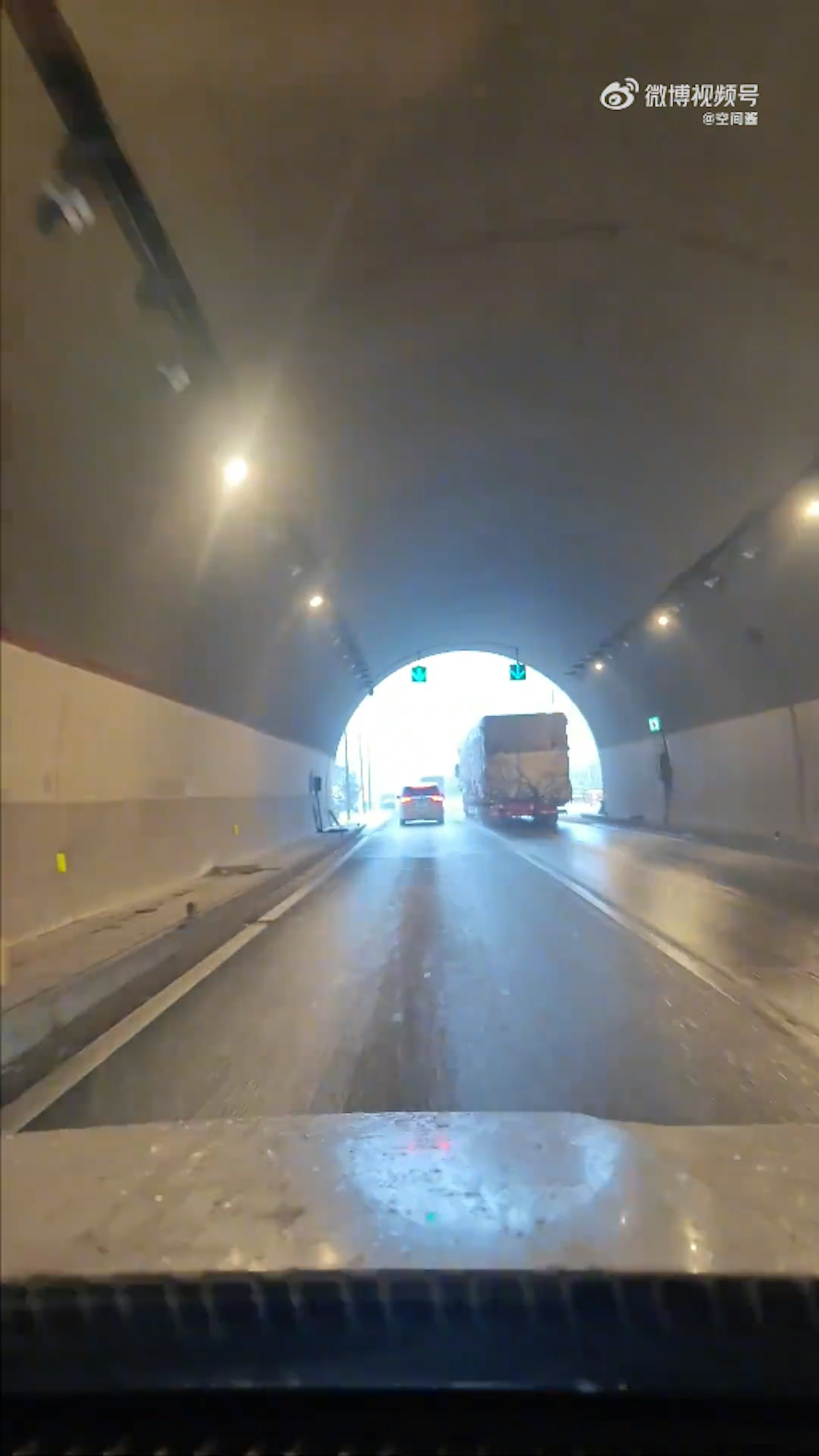 ; I+ Y( j' ^( V6 t6 I一名男子由南向北駕車,穿過秦嶺雁鵝山隧道,竟拍攝到由綠意盎然「秒變」白雪皚皚的壯麗景色,十分震撼。(影片截圖)