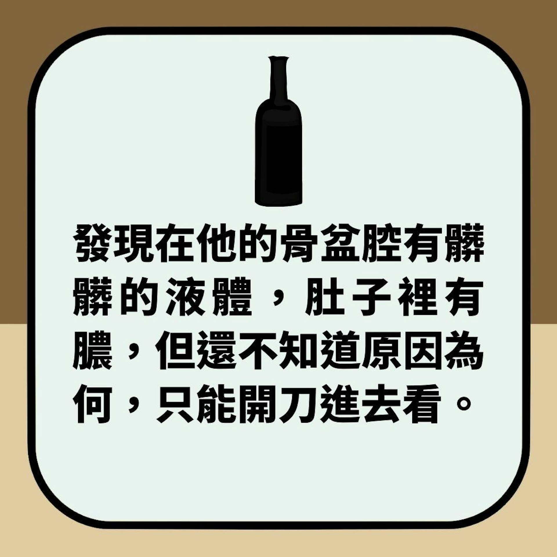 經檢查發現在男子骨盆腔有髒髒的液體,肚子裡有膿,但不知道原因為何,只有開刀才能知道……