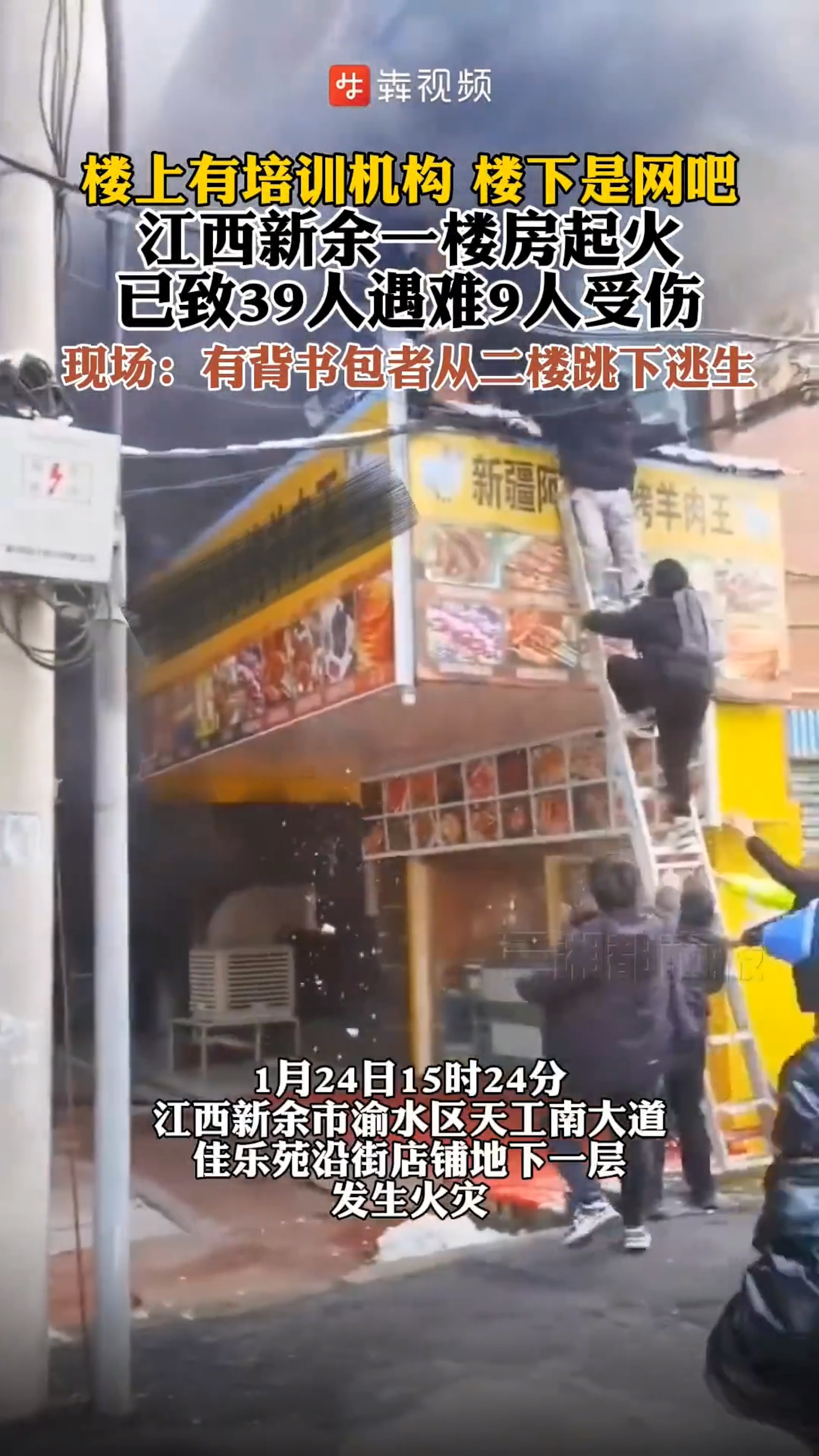 江西新余渝水區天工南大道佳樂苑沿街店鋪地下一層24日(周三)發生大火,現場濃煙滾滾,火勢兇猛,死傷慘重。多段驚險逃生片段曝光,可見有多名受困者從二樓窗戶跳到鋪設在地下的床墊上,由民警在下方逐一接住;又可見有多名背著背包的年青受困者爬梯子到地下逃生,期間有人拉著路邊電線桿的電纜線摔下樓,險象環生。