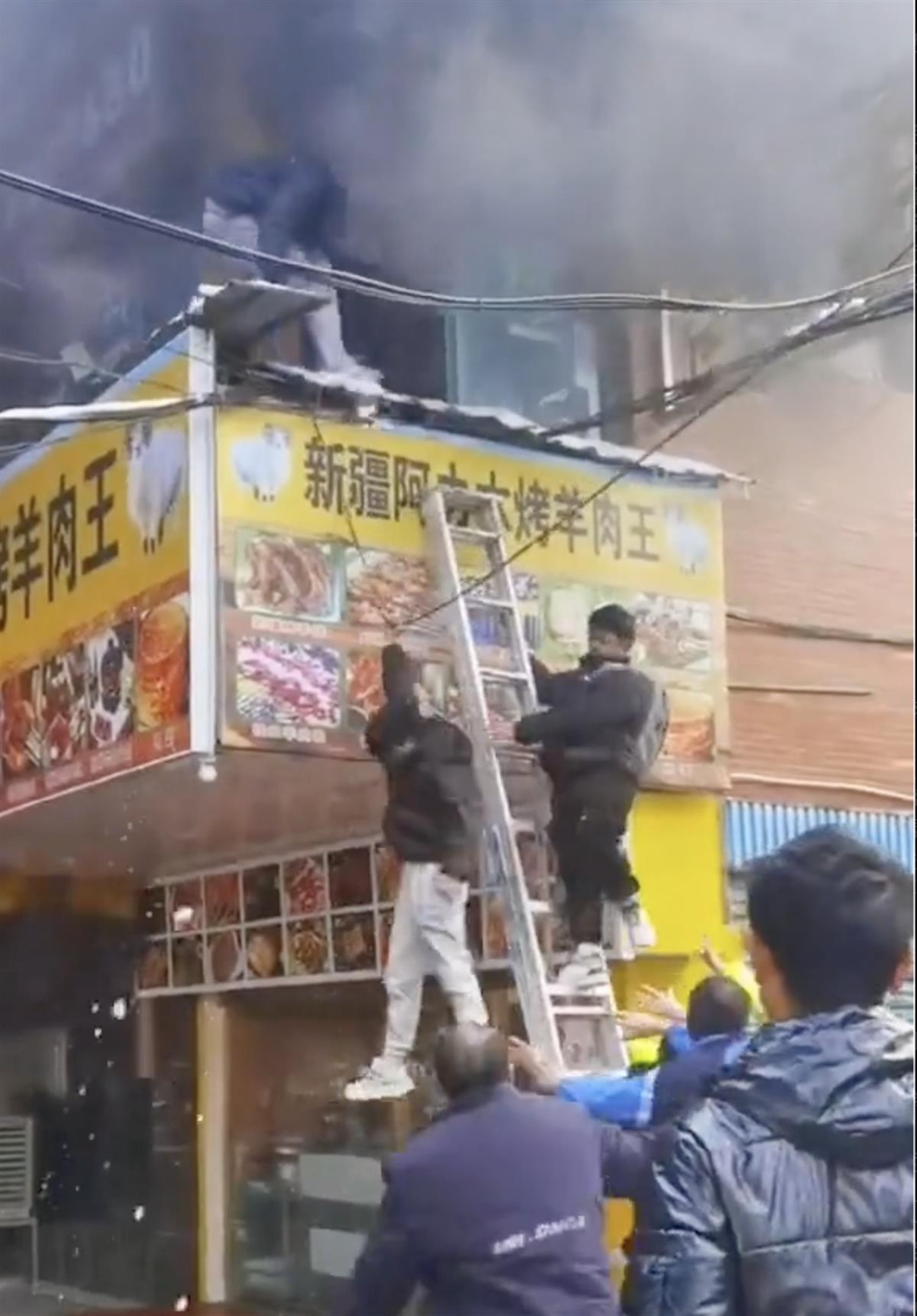 0 s ?6 L; x8 S8 O2 v& S8 ]公仔箱論壇網傳影片顯示,事發時有多名學生模樣的青年從二樓陽台的窗戶爬出來。在樓下一家烤肉店旁邊的牆上,民警、群眾等多人扶著一架梯子,這些爬窗出來的青年順著梯子爬到地下逃生。期間更有人一時慌張之下,在半空中拉著路邊電線桿的電纜線,然後直接摔下樓。年輕受困者爬梯逃生,有人拉著路邊的電纜線摔下樓.
