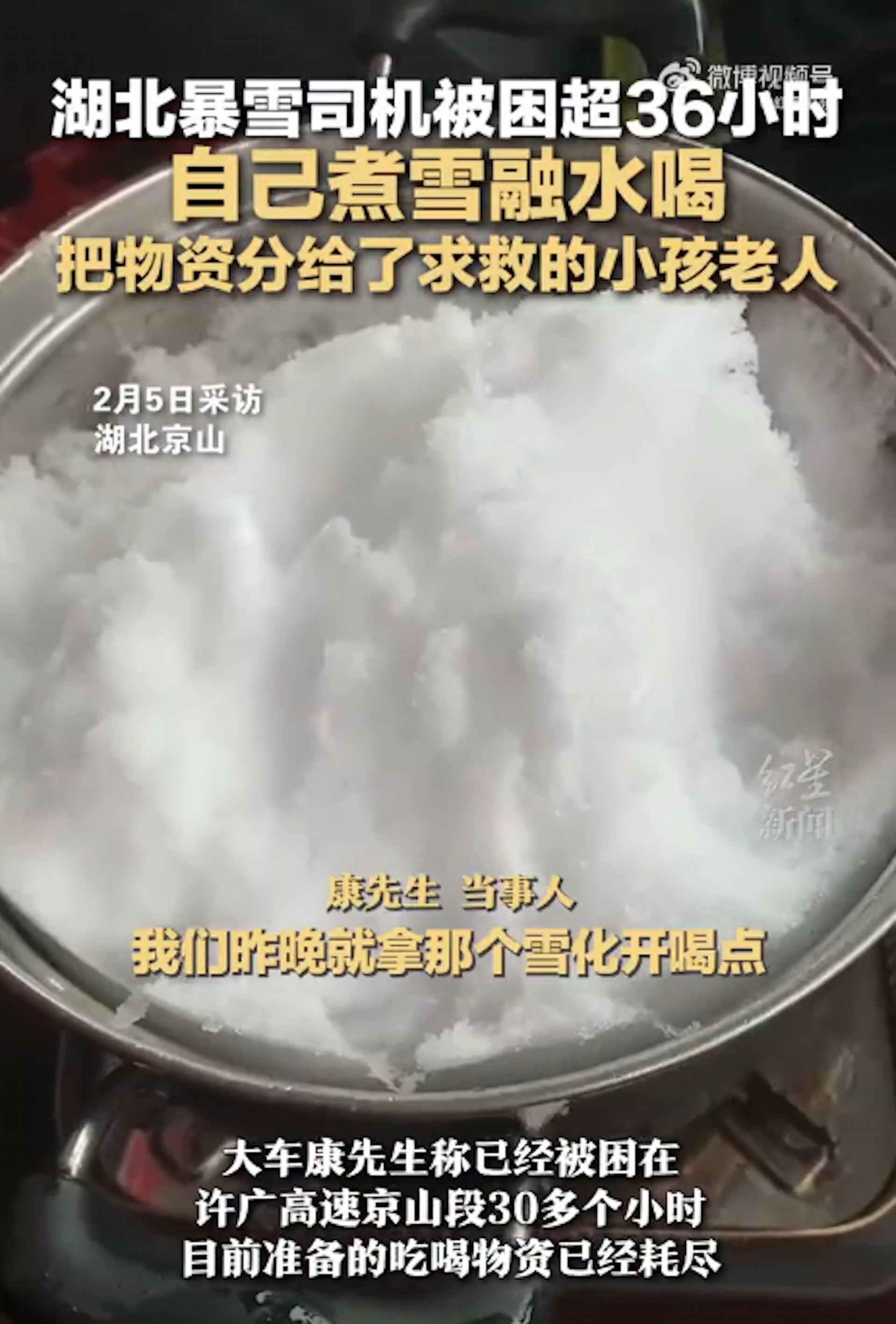 ; q" q; L# T5 ]5.39.217.77:8898湖北暴雪,被困司機自己煮雪融水喝。(影片截圖)