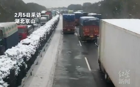 農曆新年內地「春運」期間,湖北、湖南等中東部地區迎來2009年以來最極端雨雪天氣,湖北多地高速出現封路、堵車等情況,沿路村民曾為滯留在高速國道上的司機民眾提供食物。