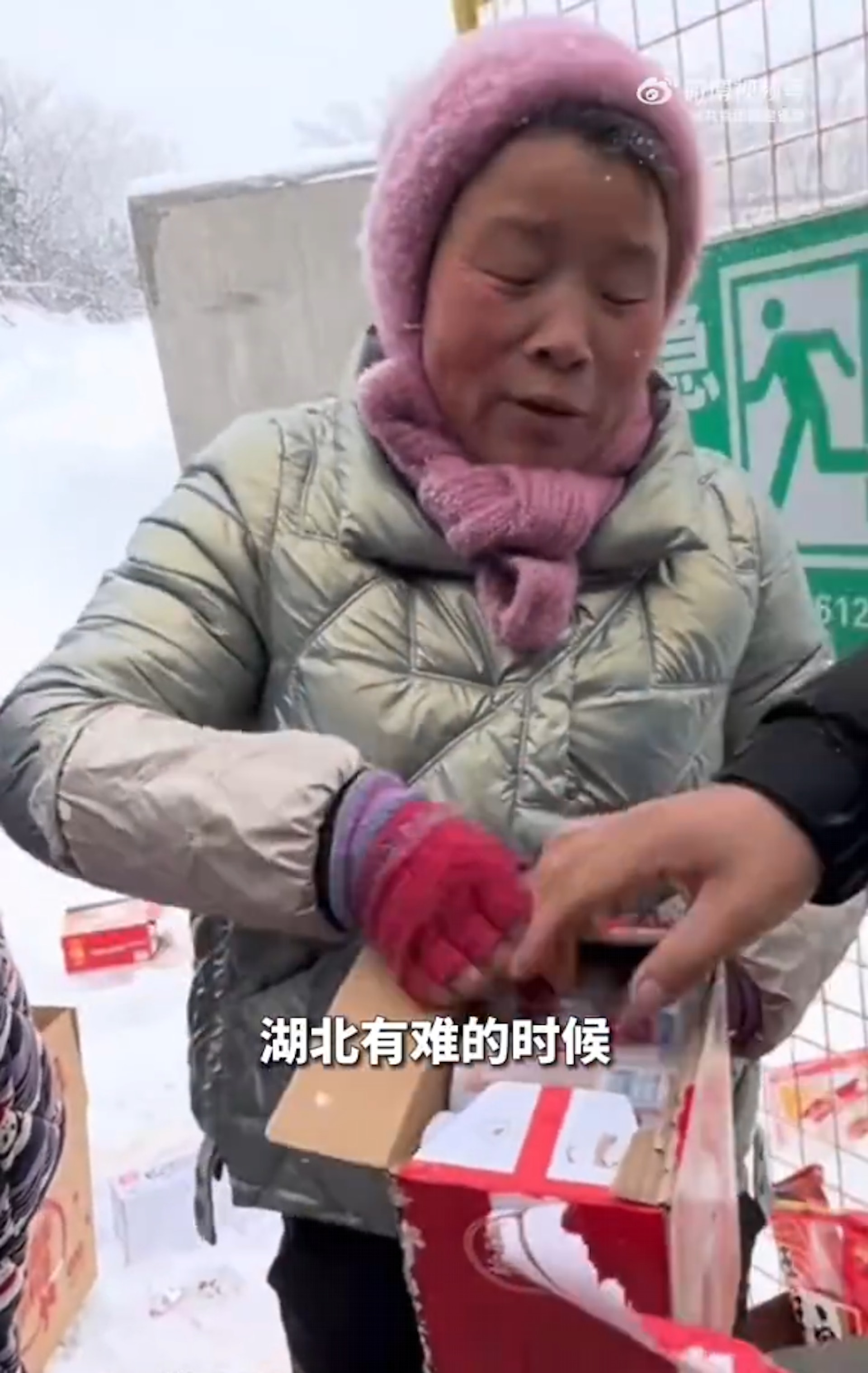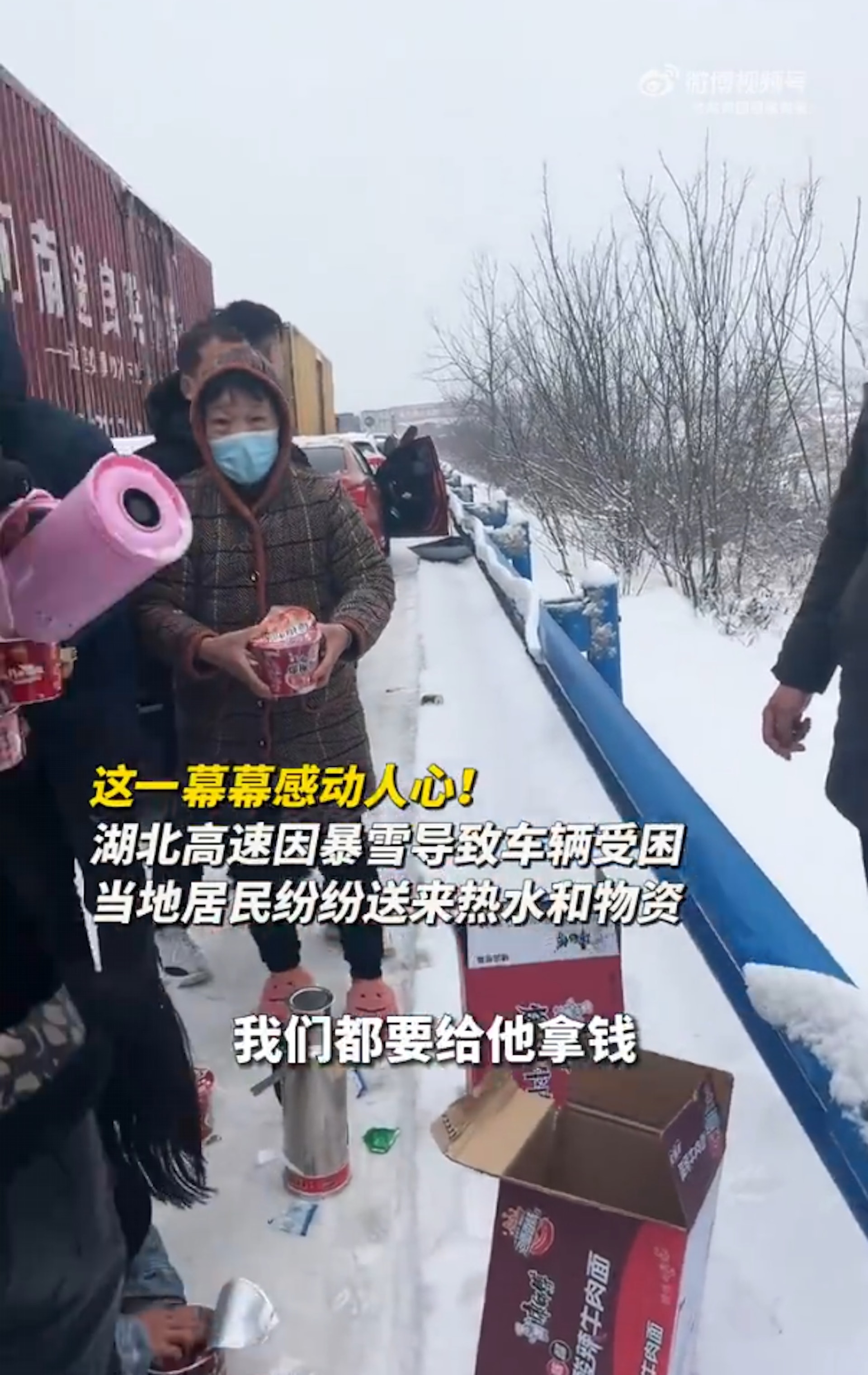 : r/ E+ K: t6 Q$ @2 }5.39.217.77:8898湖北暴雪,高速公路沿路村民開始自發為受困人員提供免費食物物資。(影片截圖)