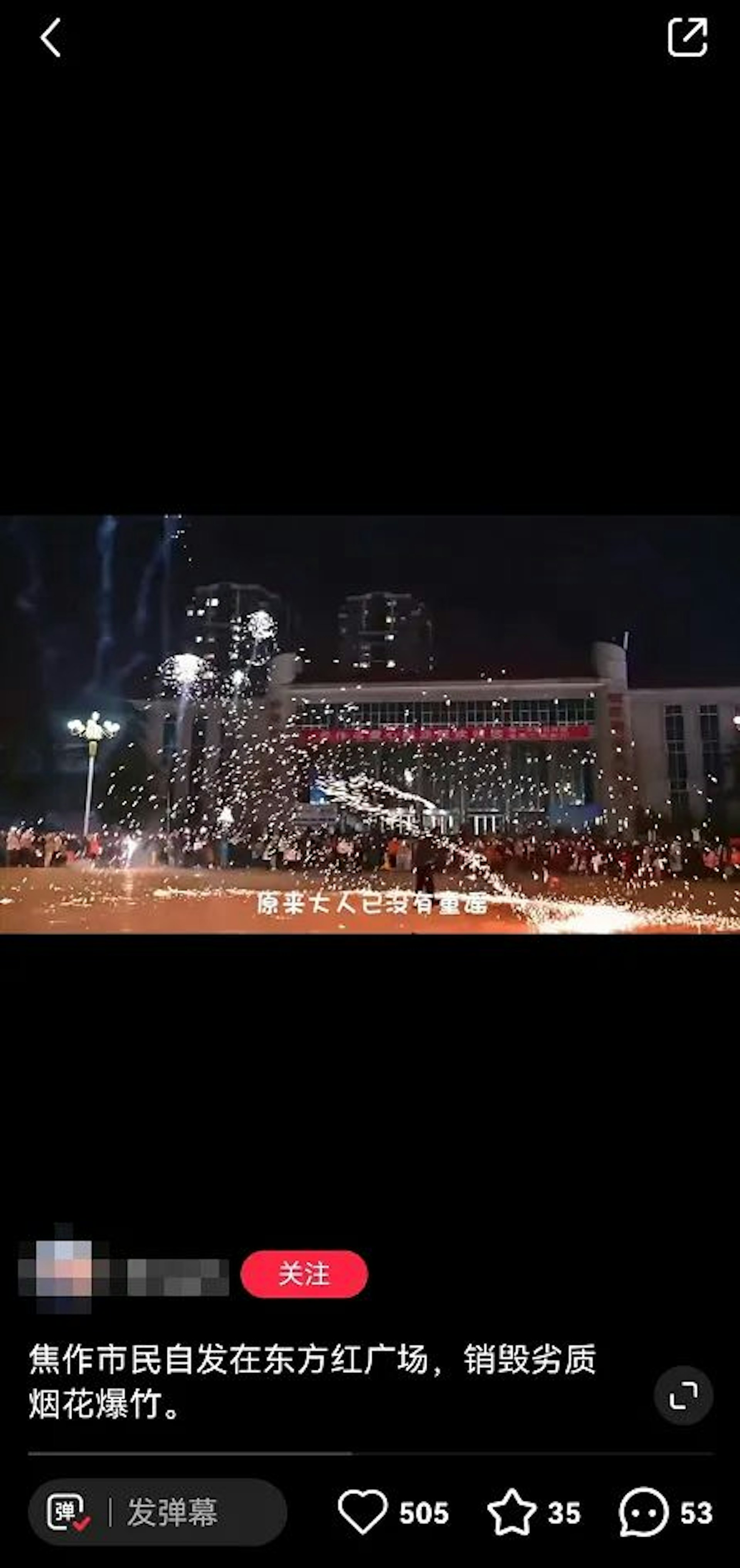 ; c F; x4 v/ e* ^; ^2 j2 t. q近日,焦作東方紅廣場上燃放煙花爆竹的場面引發關注,網上可見不少民眾聚集在該處燃放煙花爆竹。 |