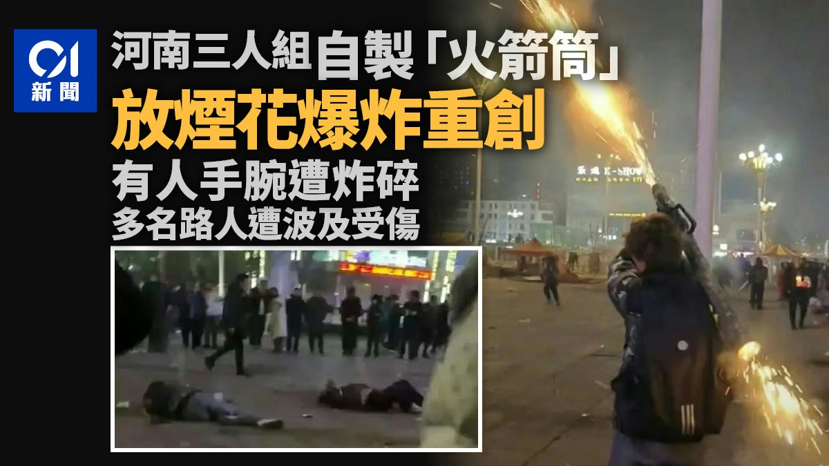 / R- F, T5 s! D! }河南焦作市近日有人在廣場上以自製工具燃放煙花時發生爆炸,事故造成至少三人嚴重受傷。從網傳照片可見,涉事者曾使用火箭筒造型的自製工具燃放煙花,該工具前後兩端均一度噴出火光。