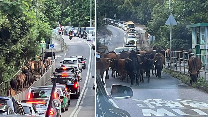 從網民提供的相片可見,一眾牛隻聯群結隊,集結在西沙路一段來回線漫步前行,可謂氣勢浩蕩。其中更有數隻牛牛在進軍期間不忘駐足啃草,盡顯野性,認真抵死!網民得悉後亦紛紛爆趣留言,稱「好疊牛」、「牛群大遷徙」。只是可憐一眾趕路的司機,因故被堵在該段單程路上進退不得,形成一條長長的車龍,有網民更搞笑代司機發聲稱,「我嘅訴求係放工」。