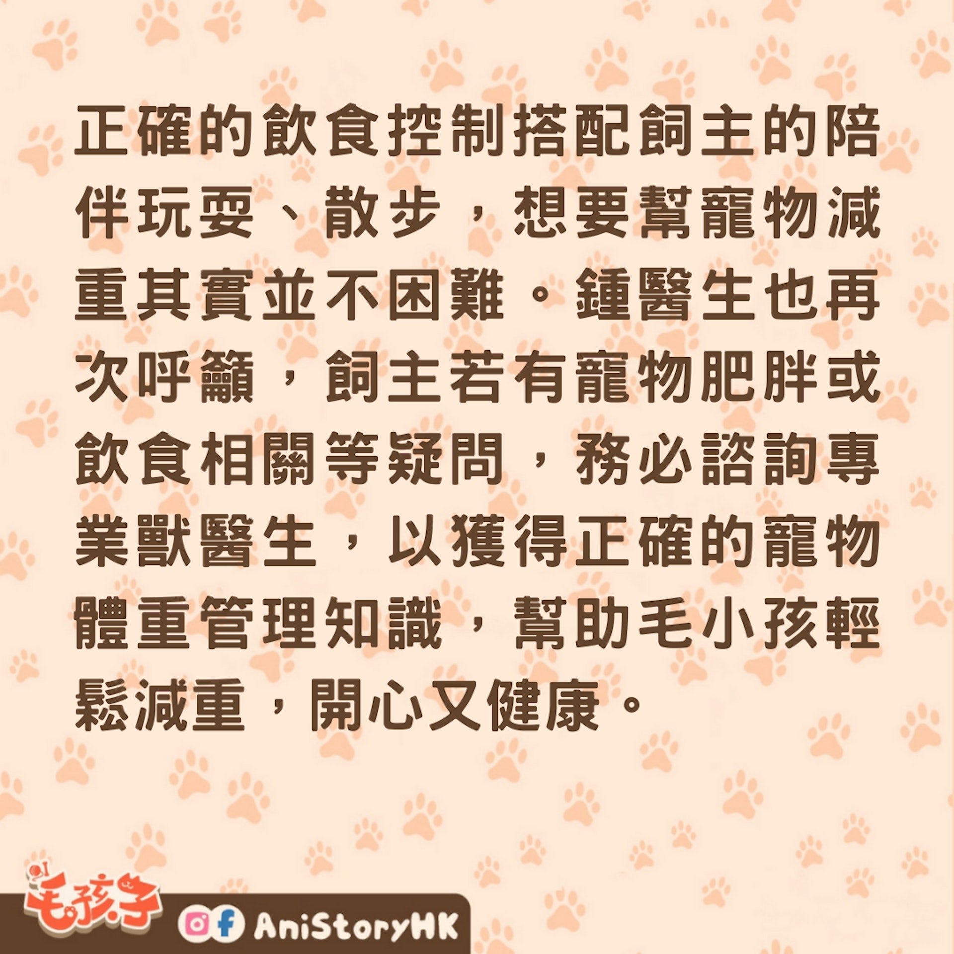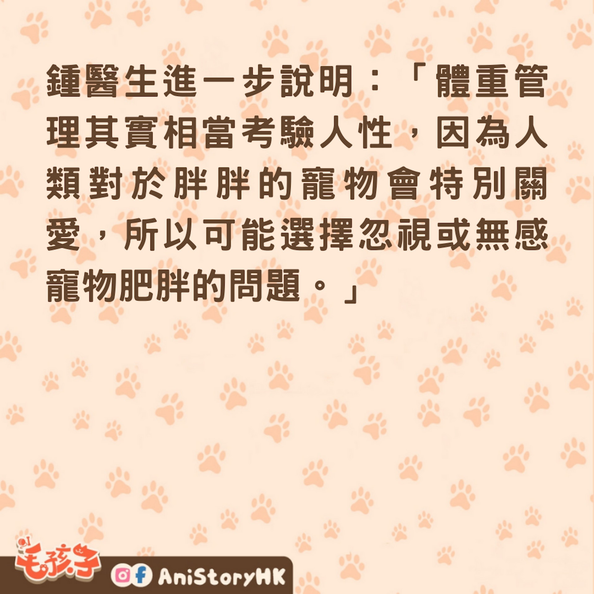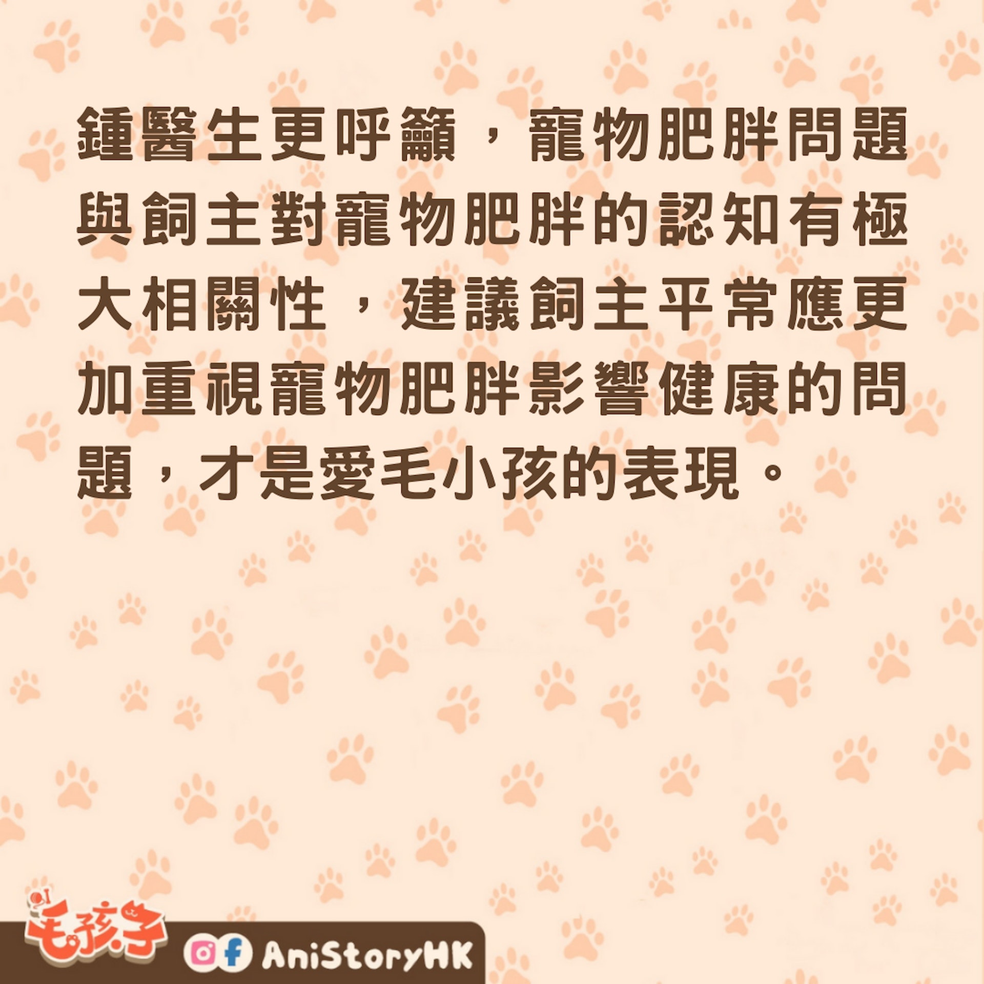 鍾醫生進一步說明:「體重管理其實相當考驗人性,因為人類對於胖胖的寵物會特別關愛,所以可能選擇忽視或無感寵物肥胖的問題。」鍾醫生更呼籲,寵物肥胖問題與飼主對寵物肥胖的認知有極大相關性,建議飼主平常應更加重視寵物肥胖影響健康的問題,才是愛毛小孩的表現。
