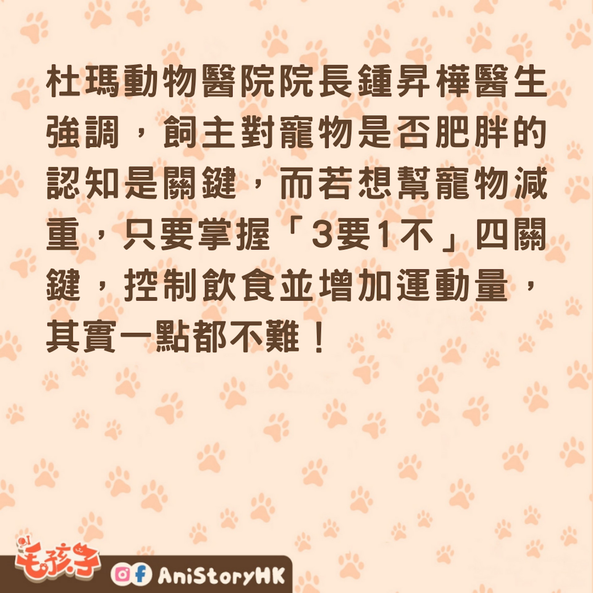 杜瑪動物醫院院長鍾昇樺醫生強調,飼主對寵物是否肥胖的認知是關鍵,而若想幫寵物減重,只要掌握「3要1不」四關鍵,控制飲食並增加運動量,其實一點都不難!