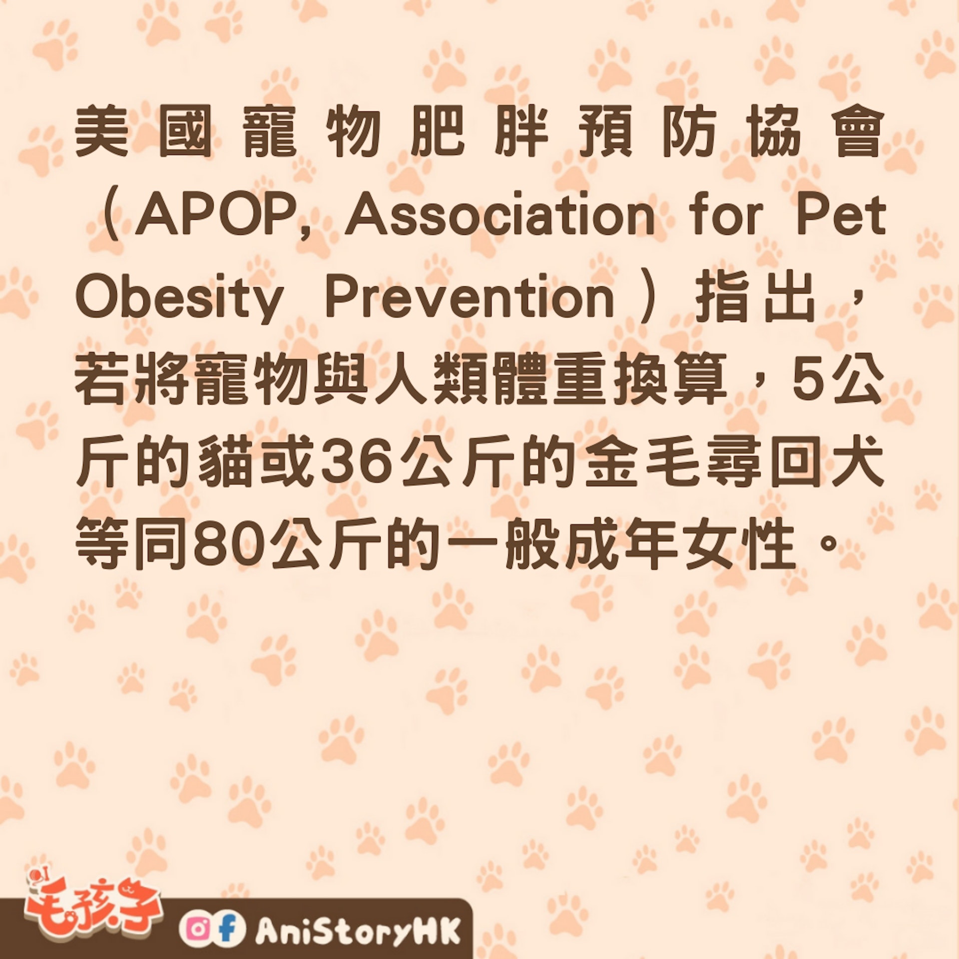 美國寵物肥胖預防協會(APOP, Association for Pet Obesity Prevention)指出,若將寵物與人類體重換算,5公斤的貓或36公斤的金毛尋回犬等同80公斤的一般成年女性。