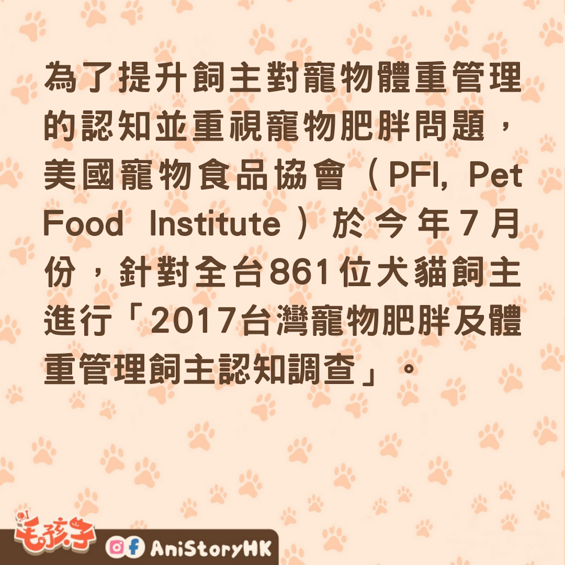 為了提升飼主對寵物體重管理的認知並重視寵物肥胖問題,美國寵物食品協會(PFI, Pet Food Institute)於今年7月份,針對全台861位犬貓飼主進行「2017台灣寵物肥胖及體重管理飼主認知調查」。調查發現,6成的貓和狗仍有減肥空間※注1,同時有近3成的貓體脂肪超過36%,屬中高度風險等級。