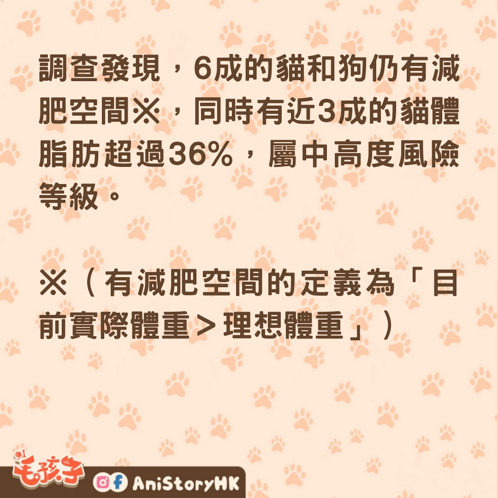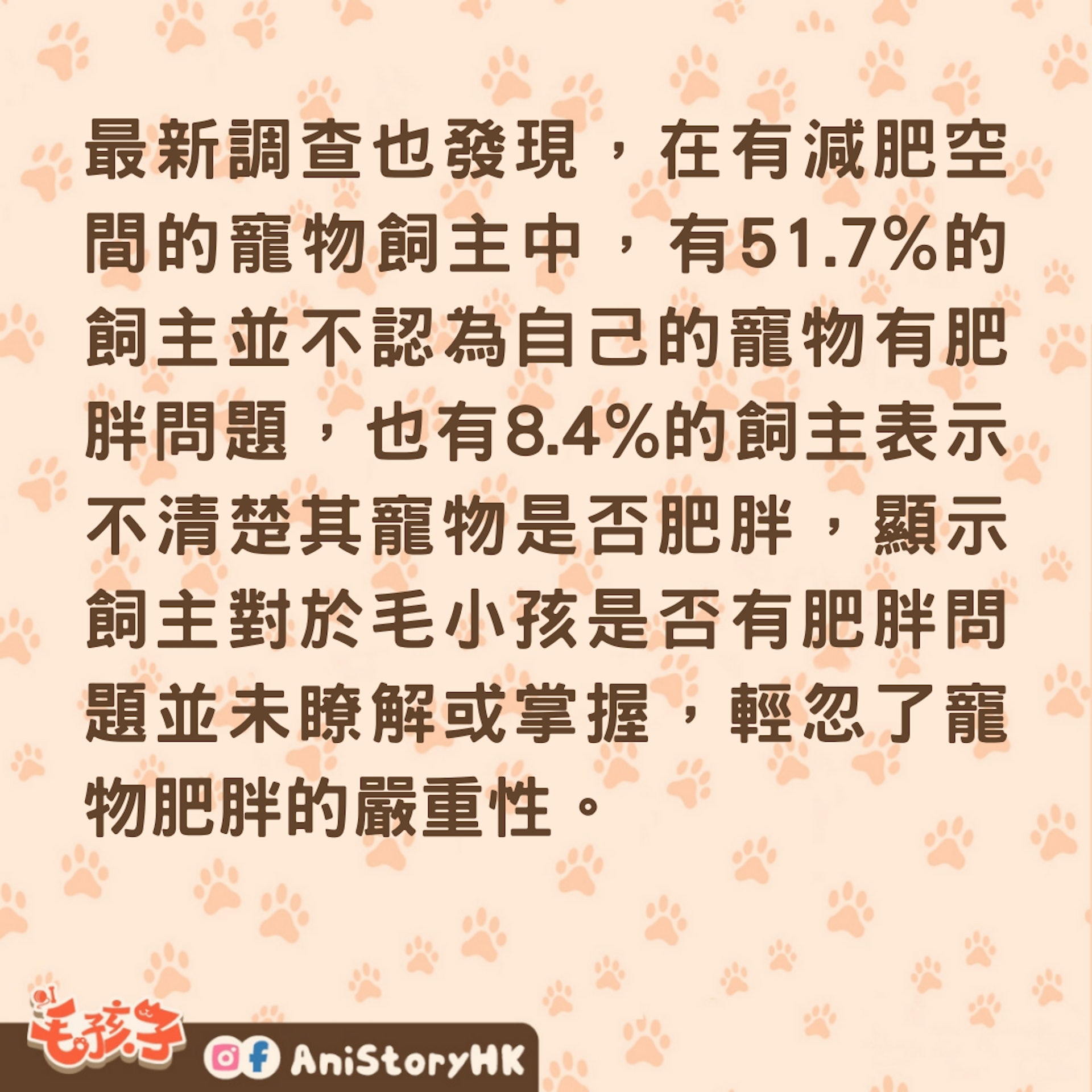 最新調查也發現,在有減肥空間的寵物飼主中,有51.7%的飼主並不認為自己的寵物有肥胖問題,也有8.4%的飼主表示不清楚其寵物是否肥胖,顯示飼主對於毛小孩是否有肥胖問題並未瞭解或掌握,輕忽了寵物肥胖的嚴重性。