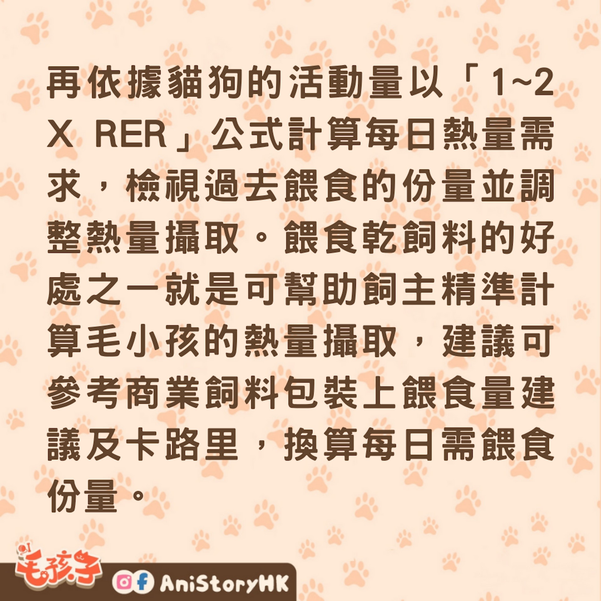 飼主可利用「體重(kg) X 30+70大卡」公式計算寵物每日所需最低卡路里量(RER),確保攝取適當熱量,再依據貓狗的活動量以「1~2 X RER」公式計算每日熱量需求,檢視過去餵食的份量並調整熱量攝取。餵食乾飼料的好處之一就是可幫助飼主精準計算毛小孩的熱量攝取,建議可參考商業飼料包裝上餵食量建議及卡路里,換算每日需餵食份量。