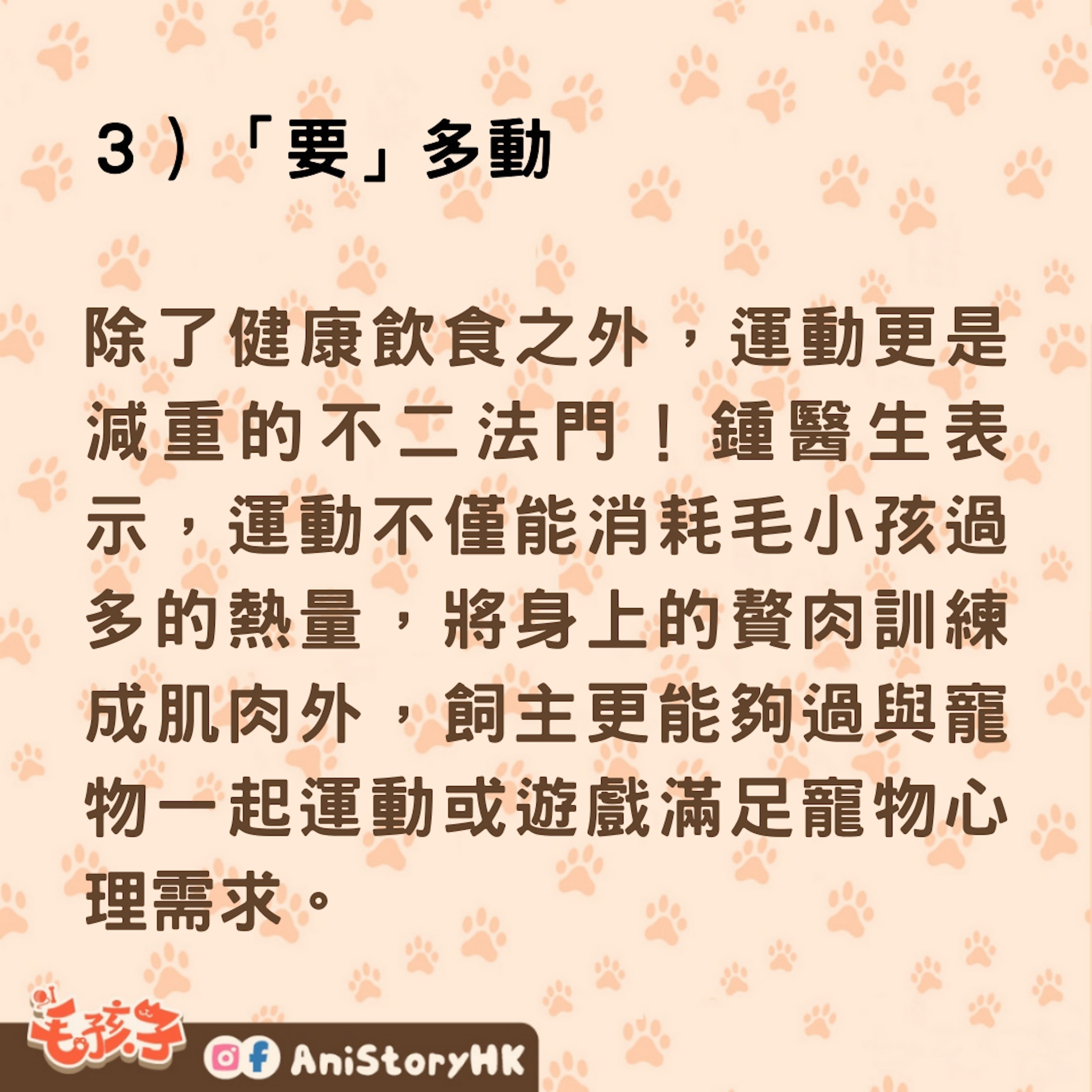 除了健康飲食之外,運動更是減重的不二法門!鍾醫生表示,運動不僅能消耗毛小孩過多的熱量,將身上的贅肉訓練成肌肉外,飼主更能夠過與寵物一起運動或遊戲滿足寵物心理需求。