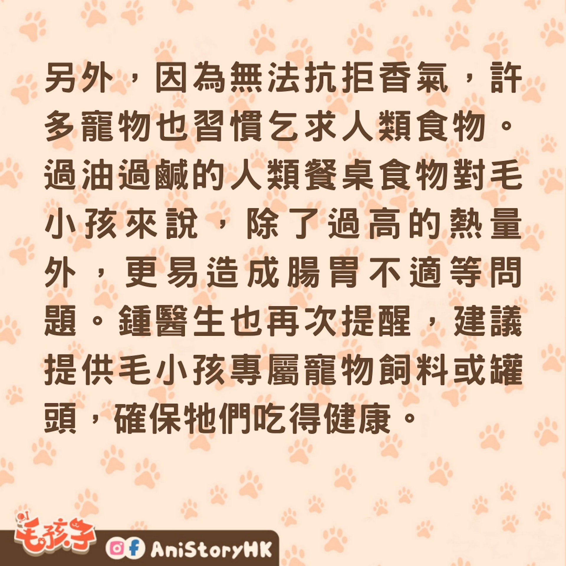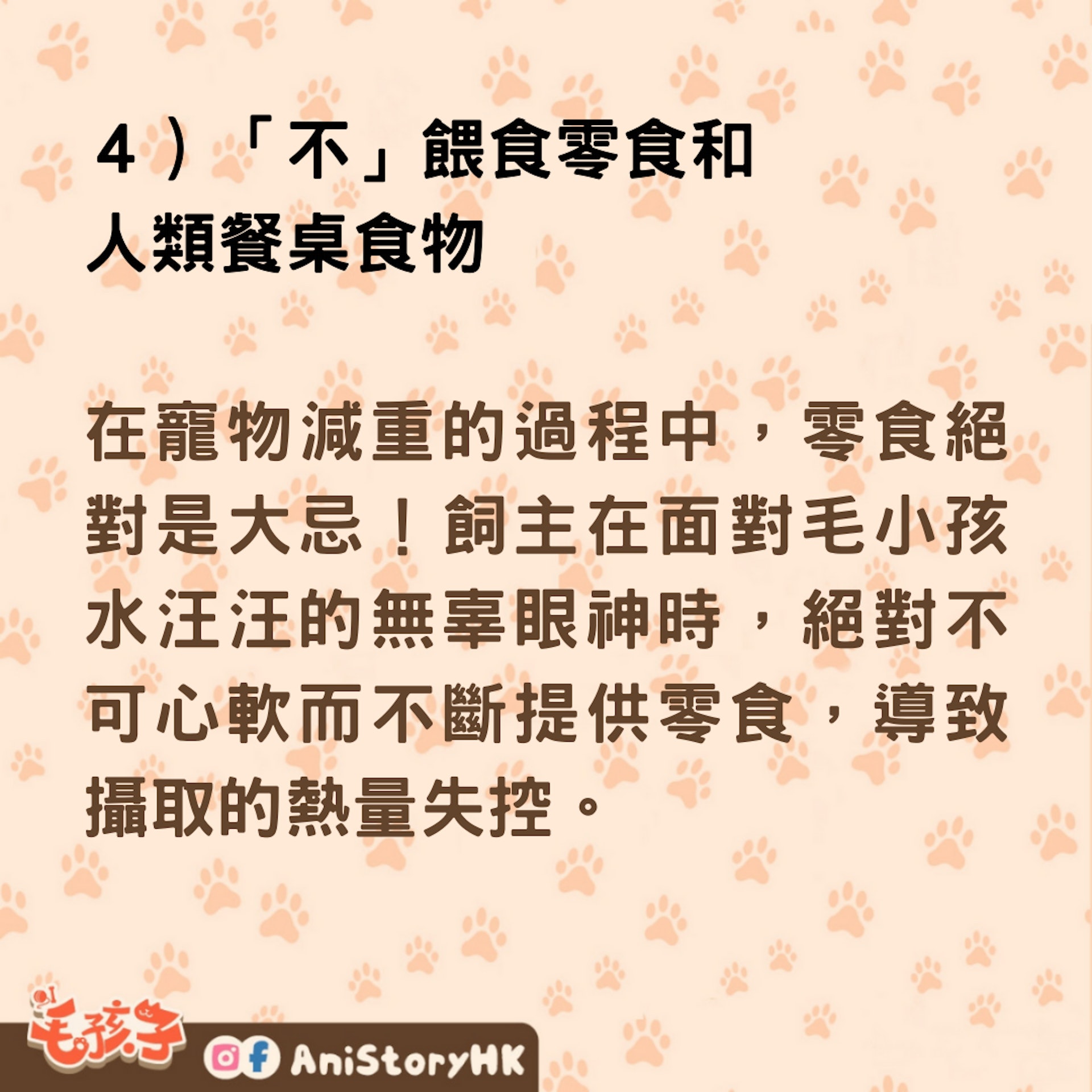 在寵物減重的過程中,零食絕對是大忌!飼主在面對毛小孩水汪汪的無辜眼神時,絕對不可心軟而不斷提供零食,導致攝取的熱量失控。另外,因為無法抗拒香氣,許多寵物也習慣乞求人類食物。過油過鹹的人類餐桌食物對毛小孩來說,除了過高的熱量外,更易造成腸胃不適等問題。鍾醫生也再次提醒,建議提供毛小孩專屬寵物飼料或罐頭,確保牠們吃得健康。 |