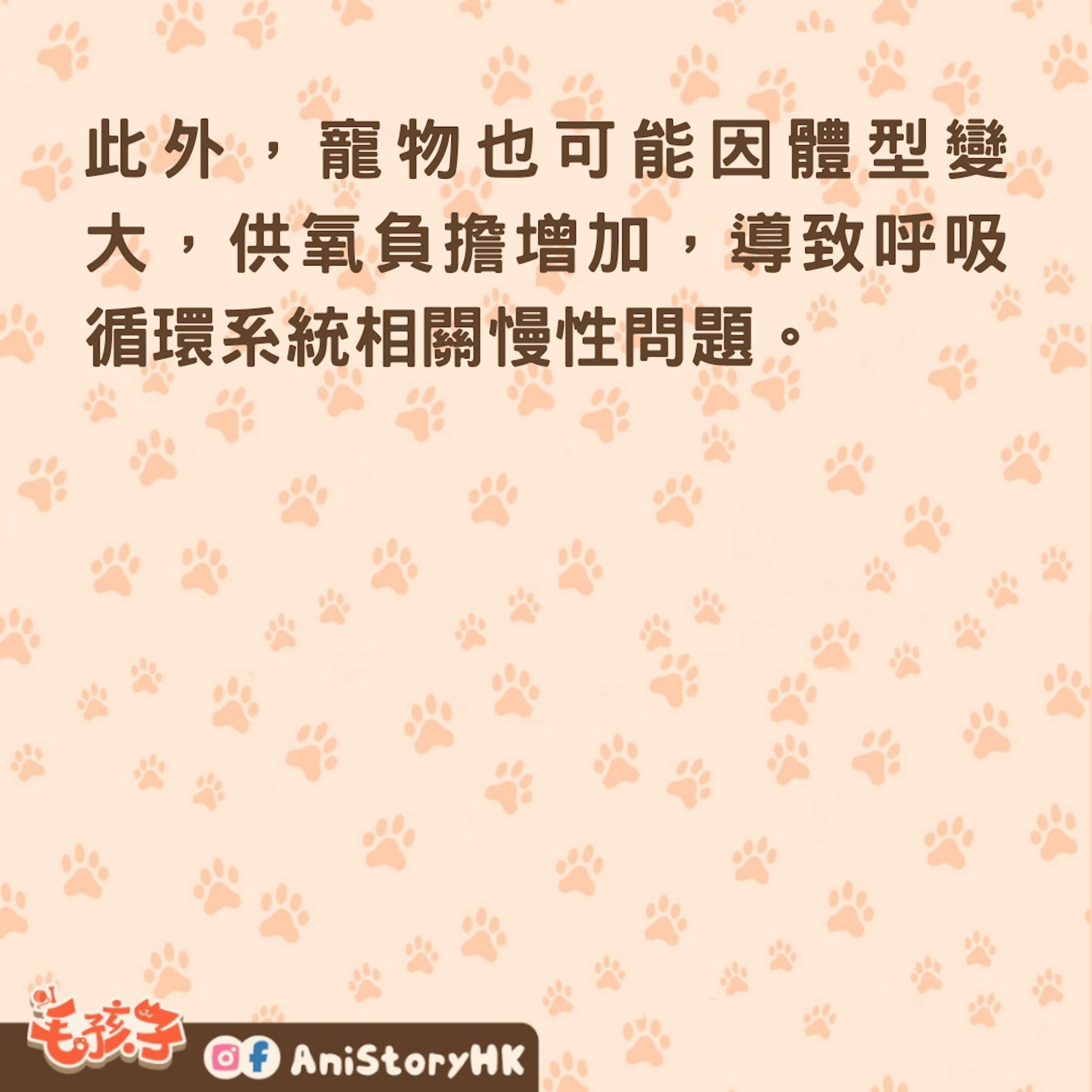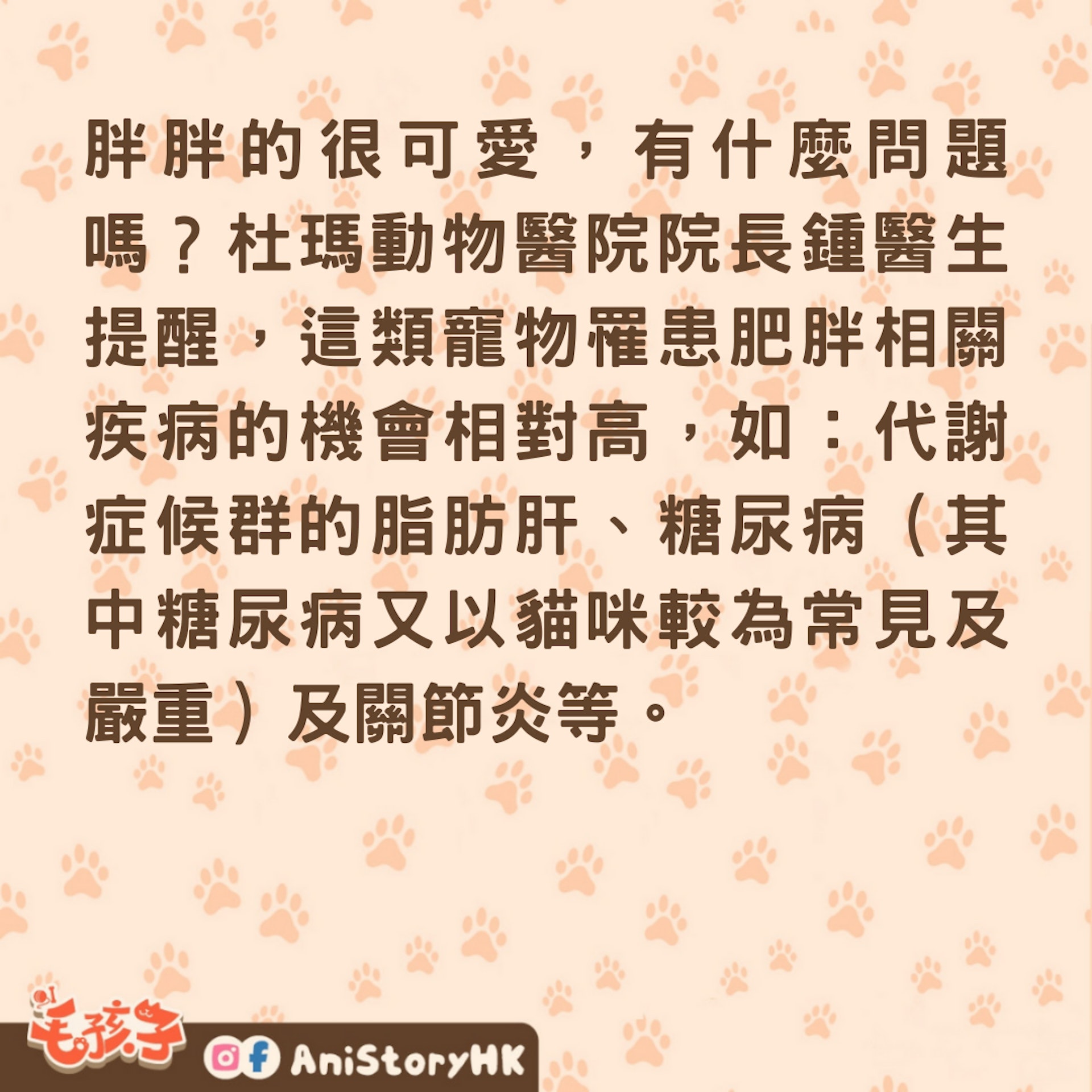 胖胖的很可愛,有什麼問題嗎?杜瑪動物醫院院長鍾醫生提醒,這類寵物罹患肥胖相關疾病的機會相對高,如:代謝症候群的脂肪肝、糖尿病※注2及關節炎等。此外,寵物也可能因體型變大,供氧負擔增加,導致呼吸循環系統相關慢性問題。
