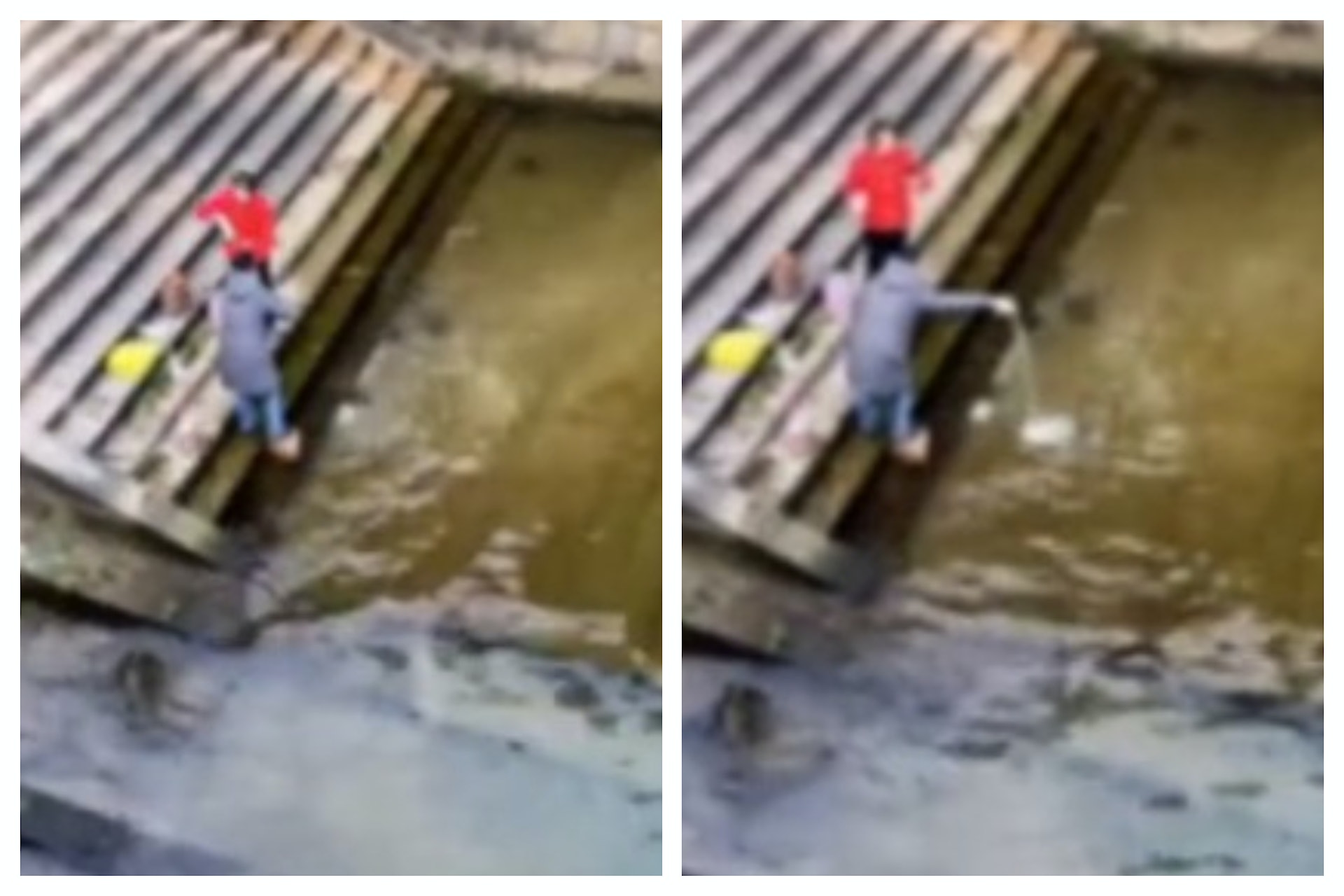 湖南再現奇葩放生!2女將「米、麵粉混牛奶」倒江祈福。(微博截圖 / @都市頻道)