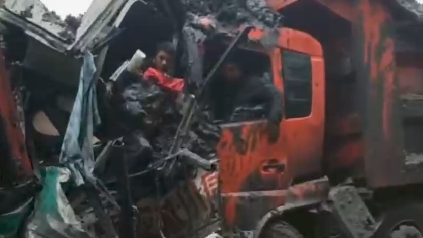 6 L, N+ G9 e# n. N! N1 I/ t公仔箱論壇網傳影片顯示,一輛中巴車被兩輛大貨車前後夾擊,已嚴重變形、面目全非,有身著校服的人員從被夾擊車輛裡爬出,還有一名人員被困車內無法動彈。