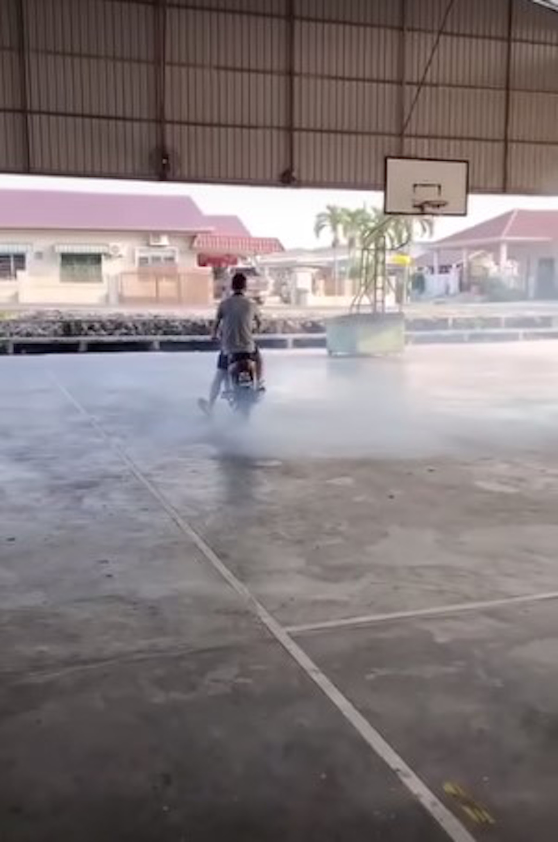 馬來西亞1名大叔嫌大媽們在籃球場高聲播歌跳舞太嘈,於是將電單車駛入球場,在大媽身旁不斷踩油製造噪音與廢氣,逼她們離開。(FB影片截圖)