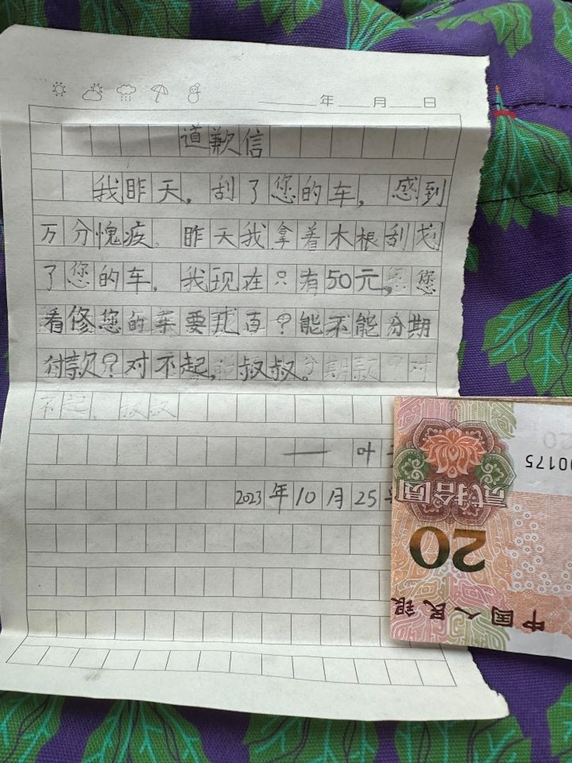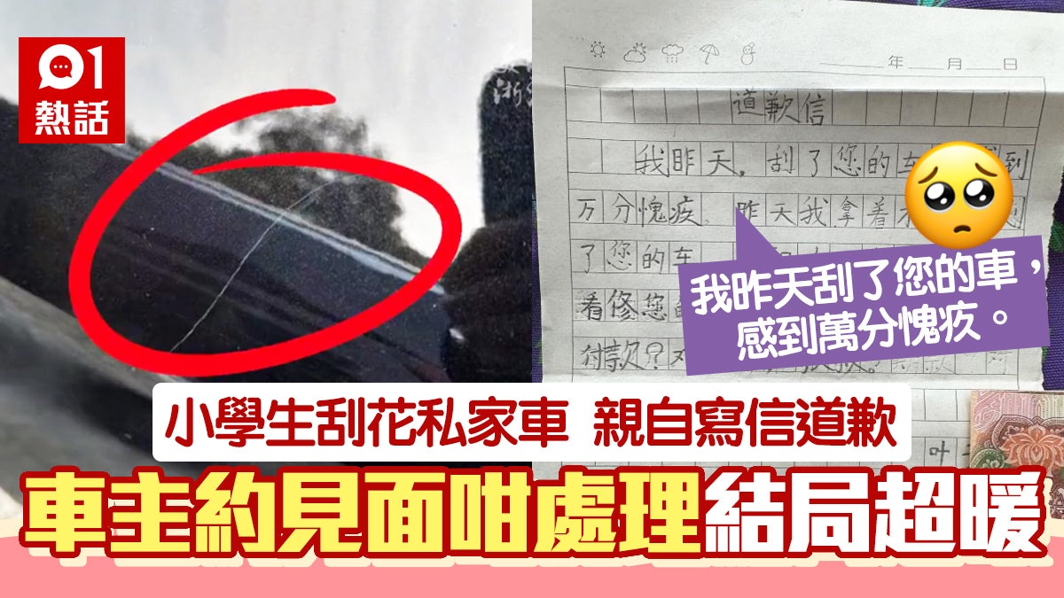當私家車準備駛離屋苑時,夫婦在出口附近遇上保安員,對方遞上封手寫信件,信內還附有50元現金。原來信件是由1名葉姓小學生親手寫下,內容表示他前一日不小心以木枝刮花許女與丈夫的車輛,「感到萬分愧疚」。+ @9 Q' k3 W. M- e' s" T. y7 e