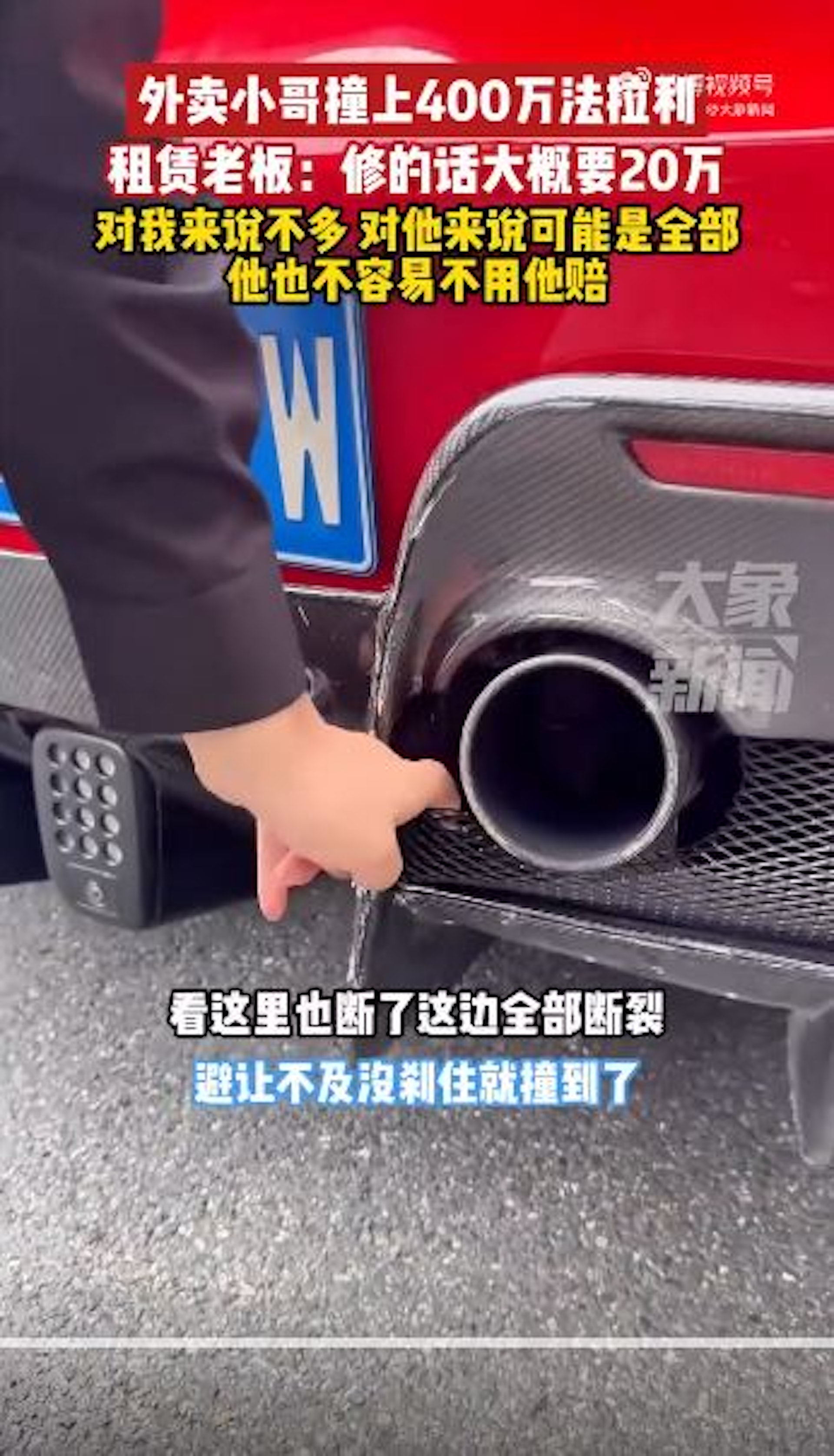 9 S9 C# J" e- [0 d V從現場影片見到,外賣員電單車猛撼向法拉利車尾。李姓男車主檢查後,發現法拉利後方死氣喉附近位置多處斷裂,估計維修費約20萬人民幣(約22萬港元)。公仔箱論壇+ U' [+ {0 @6 S6 ]; J