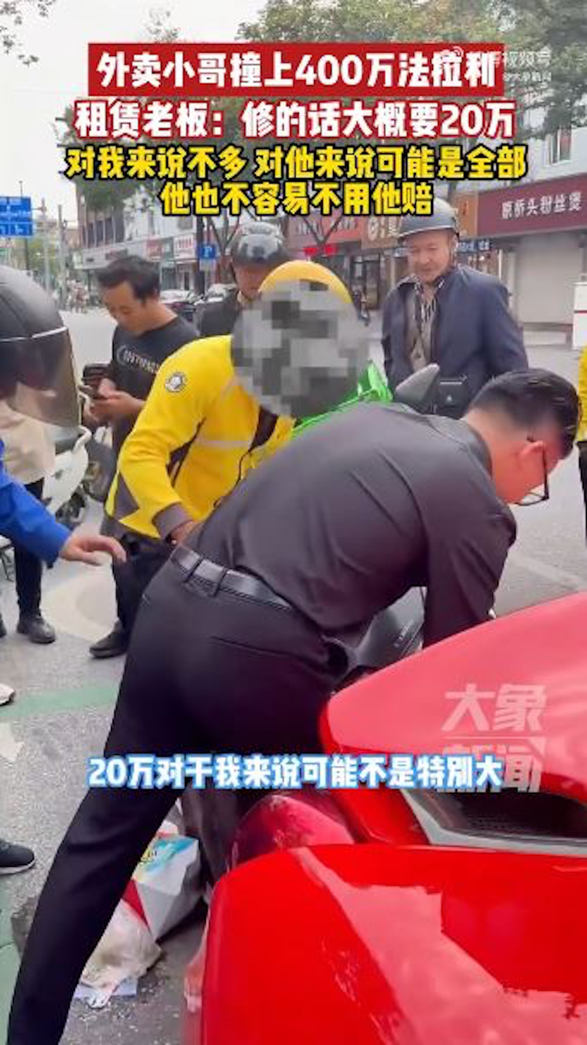 內地浙江嘉興1名外賣員駕駛電單車時,不慎撞猛撼邊價值400萬元(約435萬港元)的法拉利(Ferrari)超級跑車,然而車主暖心舉動引來激讚。(影片截圖)公仔箱論壇8 g: F9 G% c: x; S9 T