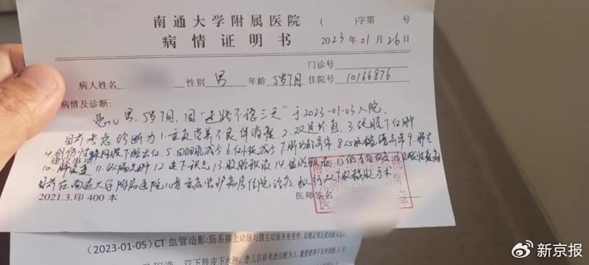 2023年1月2日,顧某某打電話給門先生說小軒生病了,腿不能走路。他趕回家後發現小軒雙腳紅腫,第一節腳趾已經發黑。送兒子就醫時,兒子說母親讓自己站在冷水裡,還用熱水燙自己。他懷疑小軒被虐待,隨後報警。因雙足壞疽,小軒子在2月1日接受了雙側小腿截斷手術。0 t$ Y7 m; ~. A/ F- `