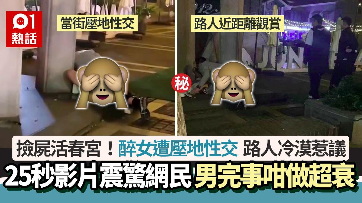 - D E. c, i3 O6 @影片見到,該對男女正在大街上就地性交,男方壓在女方身上一直有動作,女方雖然傳出一兩聲呻吟,但全程躺着沒動,未知意識是否清醒。