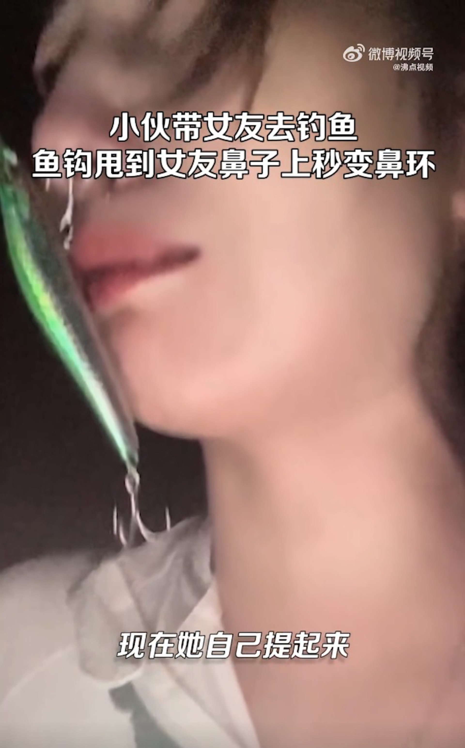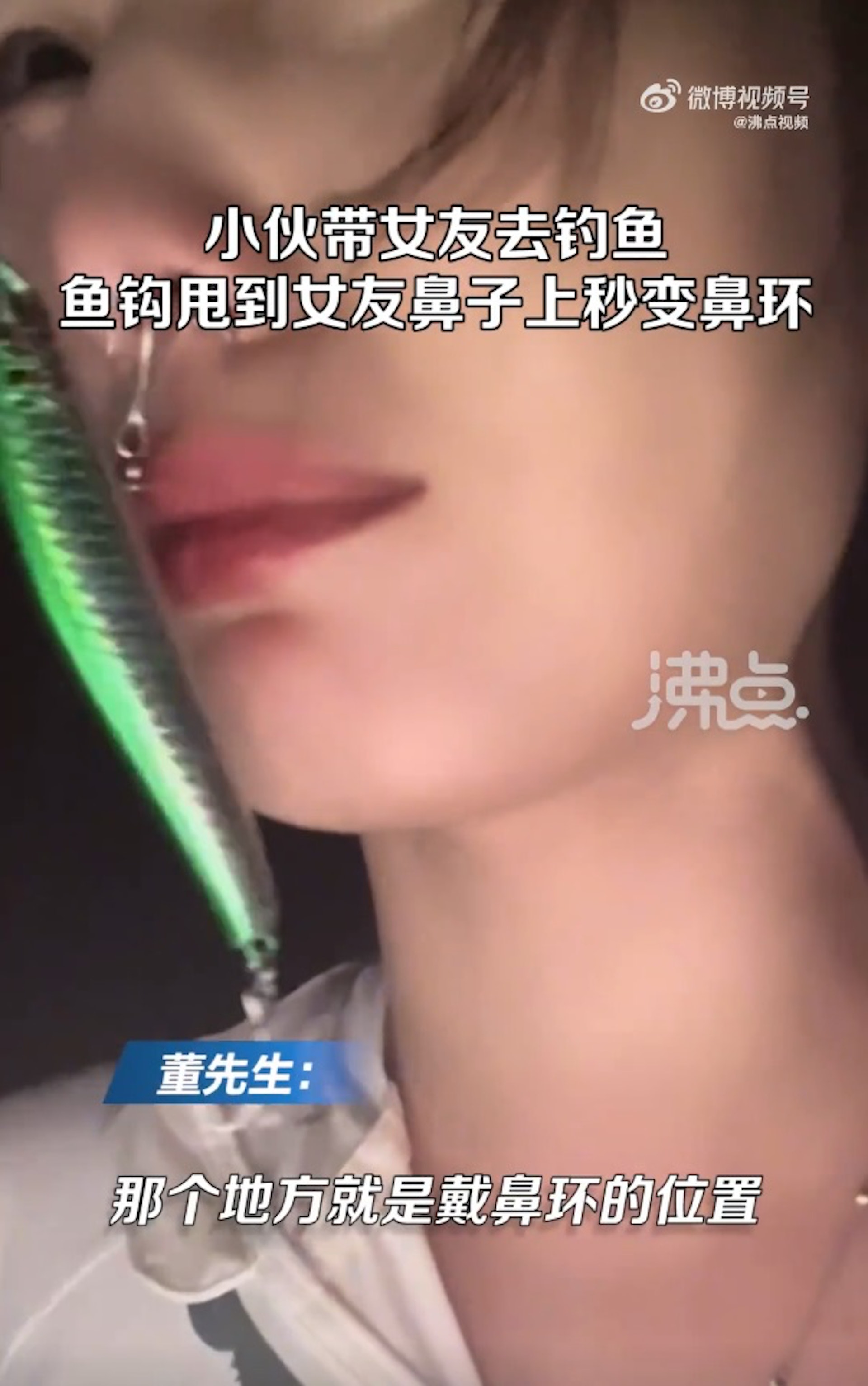 惟其後卻樂極生悲,董先生甩魚杆時不慎將魚鈎甩到女友鼻上,魚鈎剛好從鼻子中間穿過去。(「沸點視頻」影片截圖)% B3 N8 @( r1 G