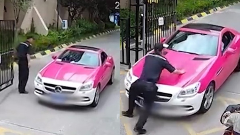 涉事車輛被改色成Barbie粉,保安為其開門。(青蜂俠)