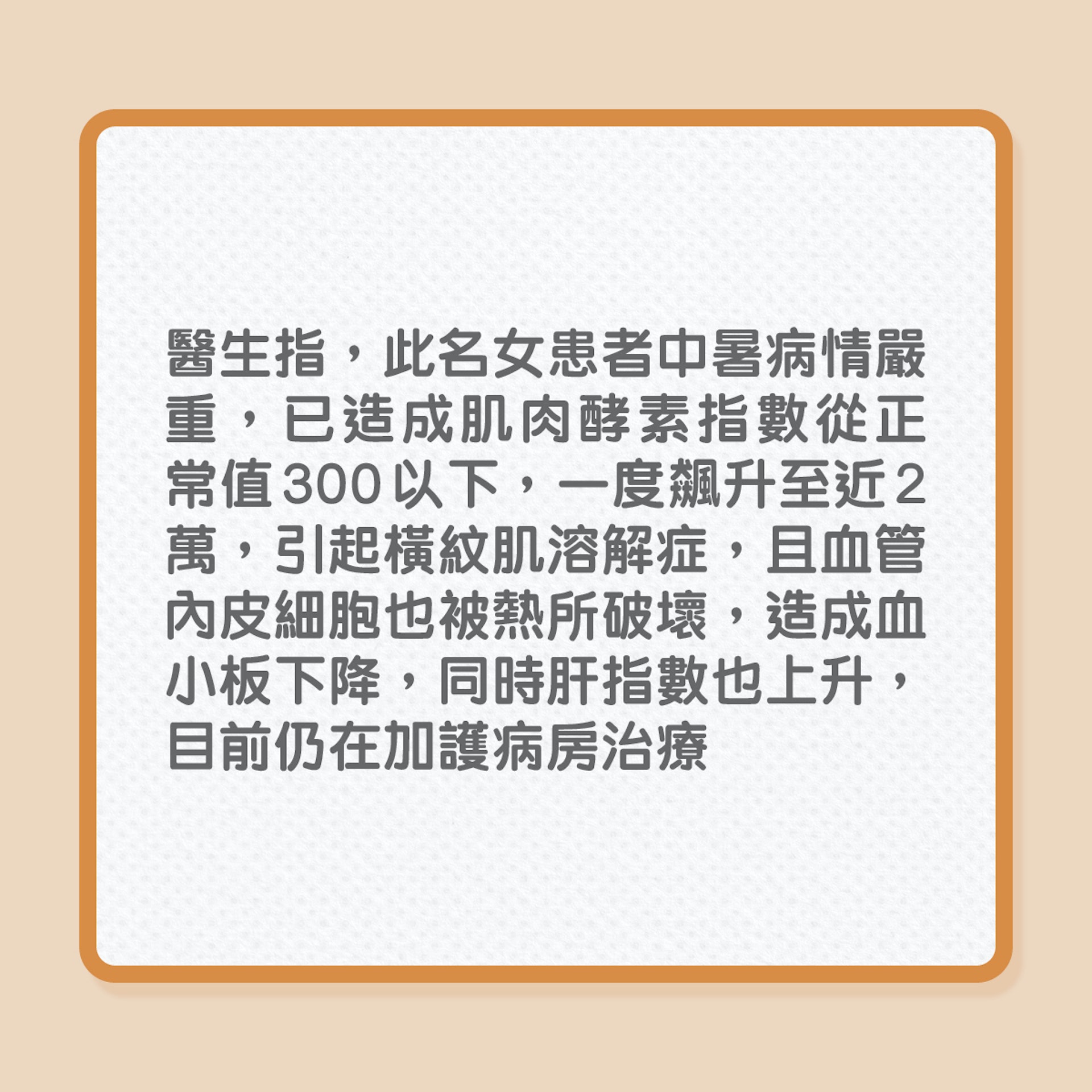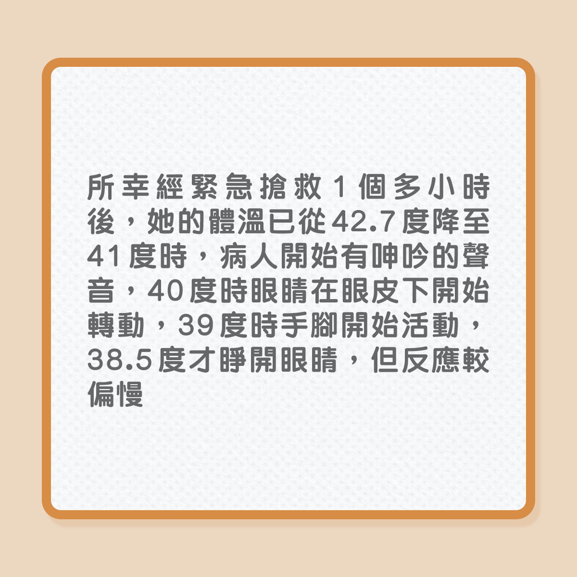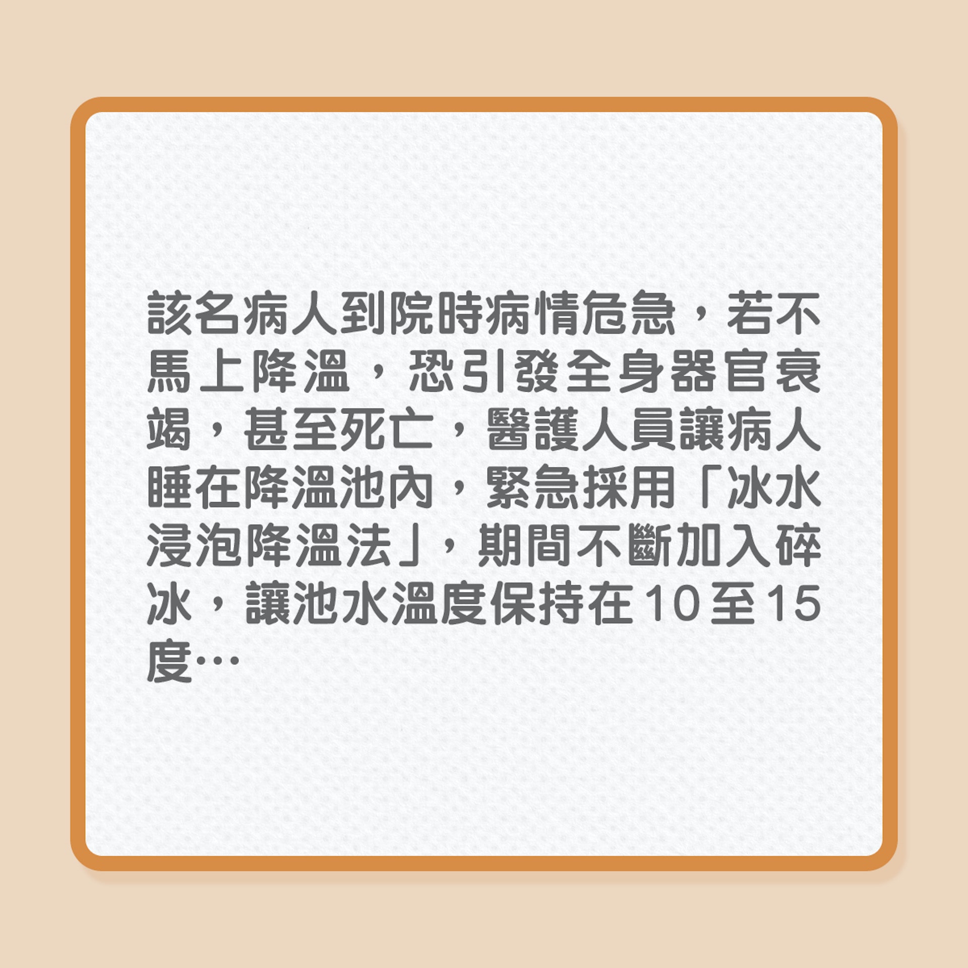 7月21日,台灣一名年約60多歲女性,上午9點時,被家人發現,怎麼叫都叫不醒緊急送醫,檢查發現,女子體溫高達42.7度,確診為中暑,醫護人員讓病人睡在降溫池內,緊急採用「冰水浸泡降溫法」,期間不斷加入碎冰,讓池水溫度保持在10至15度,約經1個多小時搶救,病人體溫降至38.5度才睜開眼睛。公仔箱論壇: k- Y/ f! G: O7 G( m