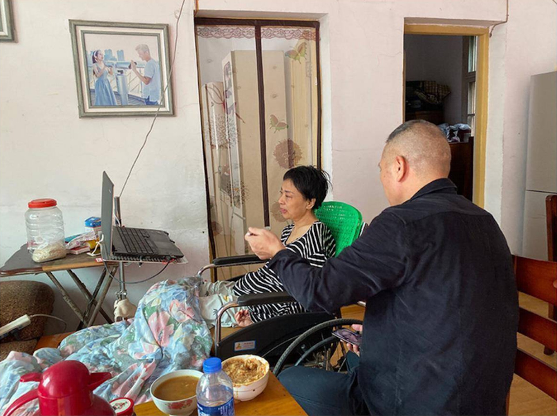 諶石軍透露,要想吃飽,起碼得3個小時,有時她吃得太累,寧願餓著。餵飯間隙,因李小中的舌頭動不了,他不時用筷子把食物撥回牙面上,此外就是刷手機、到陽臺抽煙、喝酒。諶石軍說,等她吃飯等得無聊,他就喝酒,結果酒癮越來越大。吃完,他幫她按摩,握拳搓背,他的指關節處磨出了厚繭。