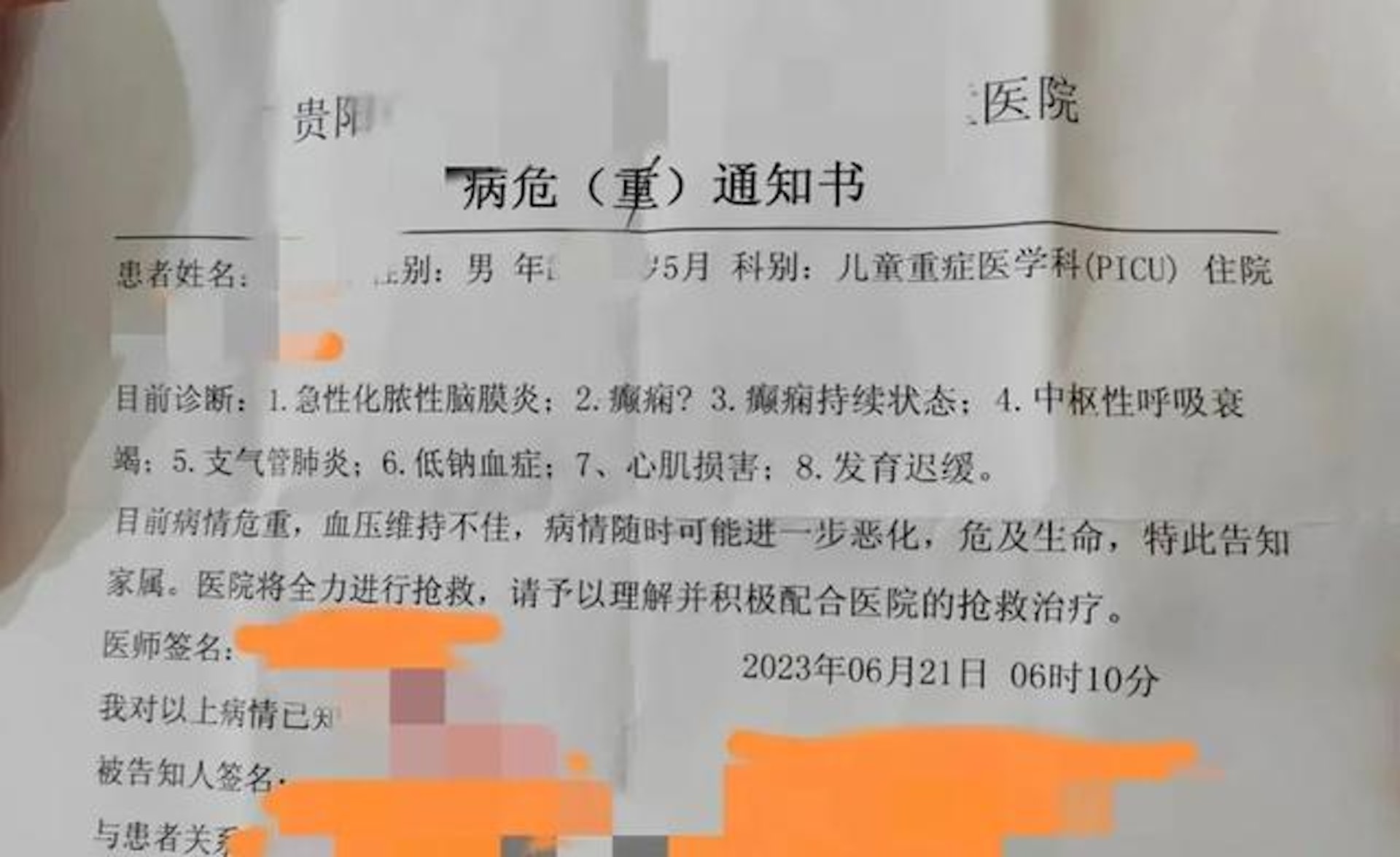 男童轉入醫院深切治療部治療後,醫院於6月21日下達病危通知書,通知書顯示醫院診斷男童患有急性化膿性腦膜炎,出現持續癲癇、中樞性呼吸衰竭、支氣管肺炎等症狀。男童病情危重,血壓維持不足,病情隨時可能進一步惡化,危及生命。5.39.217.77:88989 j- Q+ e, j2 G+ t. A