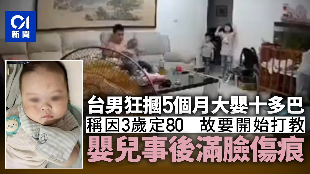 台中一名男子在家對5個月大嬰兒直呼巴掌,不到一分鐘對嬰兒打巴掌10多下,重打下聲響大,嬰兒大哭,二名幼童在旁看到很驚嚇,完全不敢動,台中市政府和警方今天都表示,正調查中。