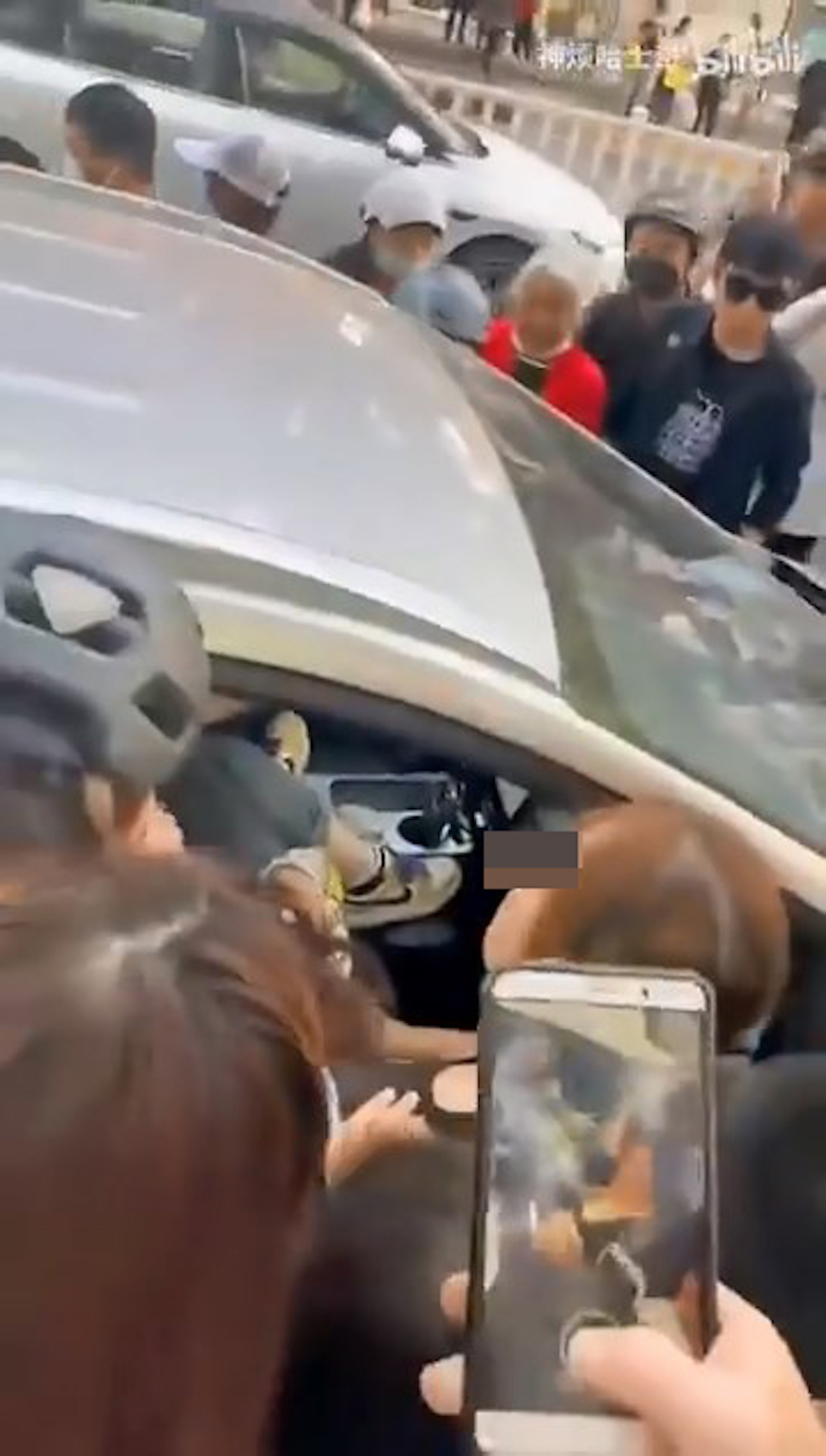 停車後,群眾和人妻合力把「小三」從車裏拉出,讓其「淨身出戶」,而男人在群眾壓力及見證下,承諾把車子,房子和孩子都給妻子。(影片截圖)