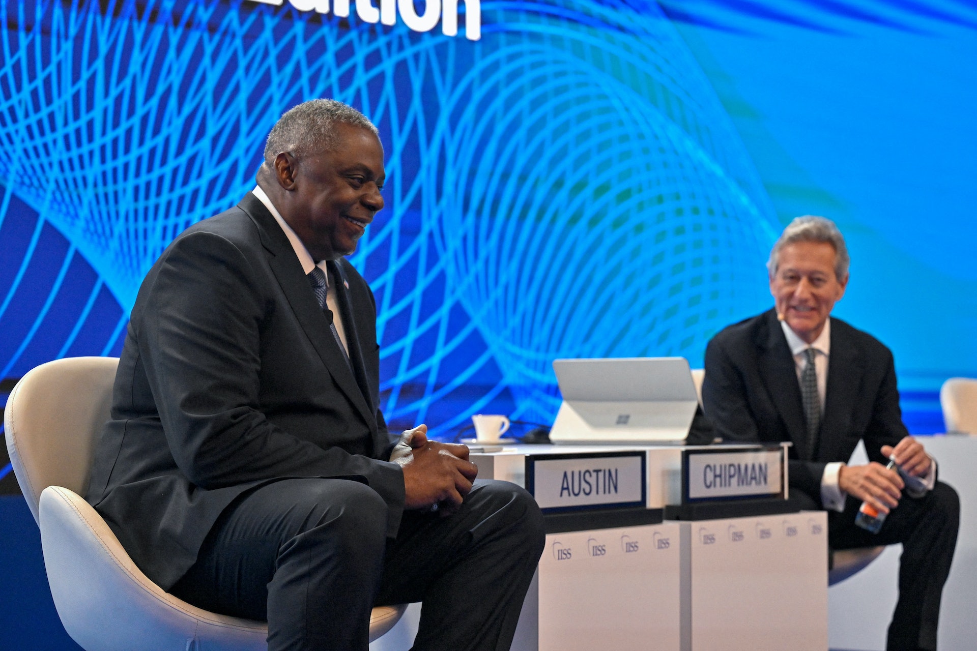 圖為奧斯汀與主辦香會的英國智庫國際戰略研究所(International Institute for Strategic Studies)總負責人奇普曼(John Chipman)對談(Reuters)# V0 u8 c" t N7 C, H5 U