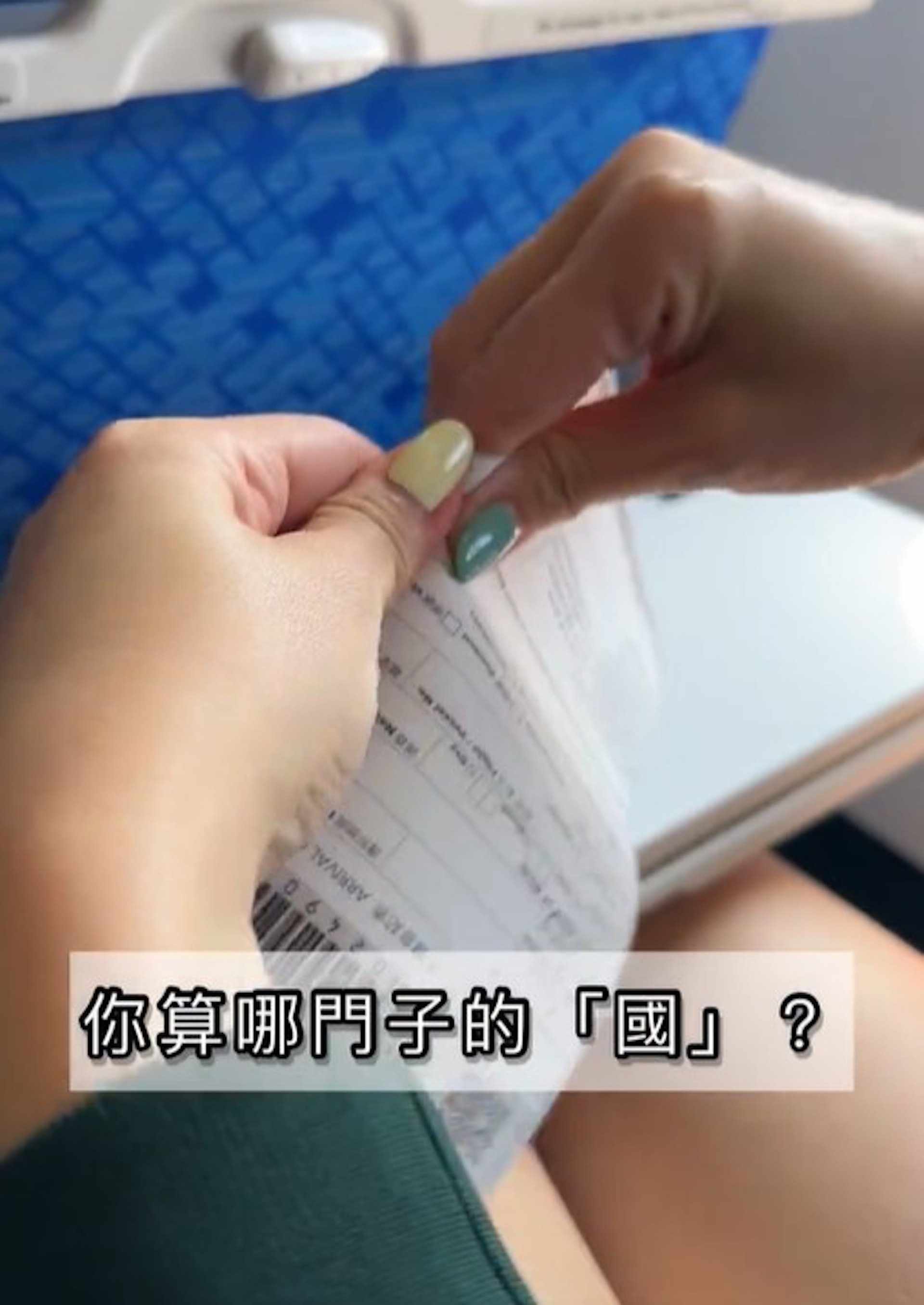 有內地女子早年移居香港並持有香港護照,而日前往台灣旅遊時,在機上獲派入國登記表,看見「入國」兩字深感不滿,怒言「你算哪門子的『國』」,更即場將登記表撕毀。(macypig@抖音截圖)