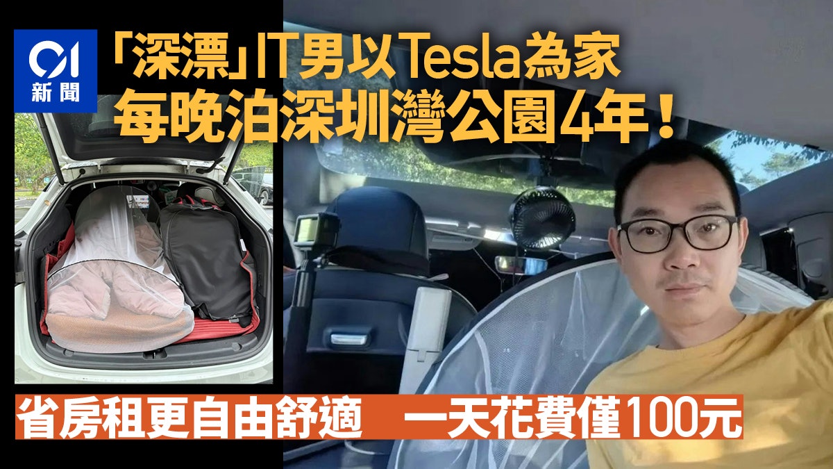 4 e# ^$ I7 e- x( Y+ O6 z公仔箱論壇張運來因在深圳灣公園的汽車內夜宿爆紅。(深圳微時光授權使用)
