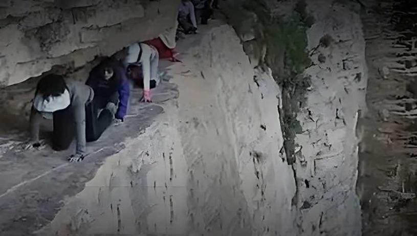 從視頻截圖上看,這段石頭縫裡的路的確讓人感到膽戰心驚,路非常窄,而且低矮,僅夠一人爬行,身側就是懸崖,而且沒有任何保護防護措施,膝蓋容易磨傷,一不小心還可能發生墜落事故。