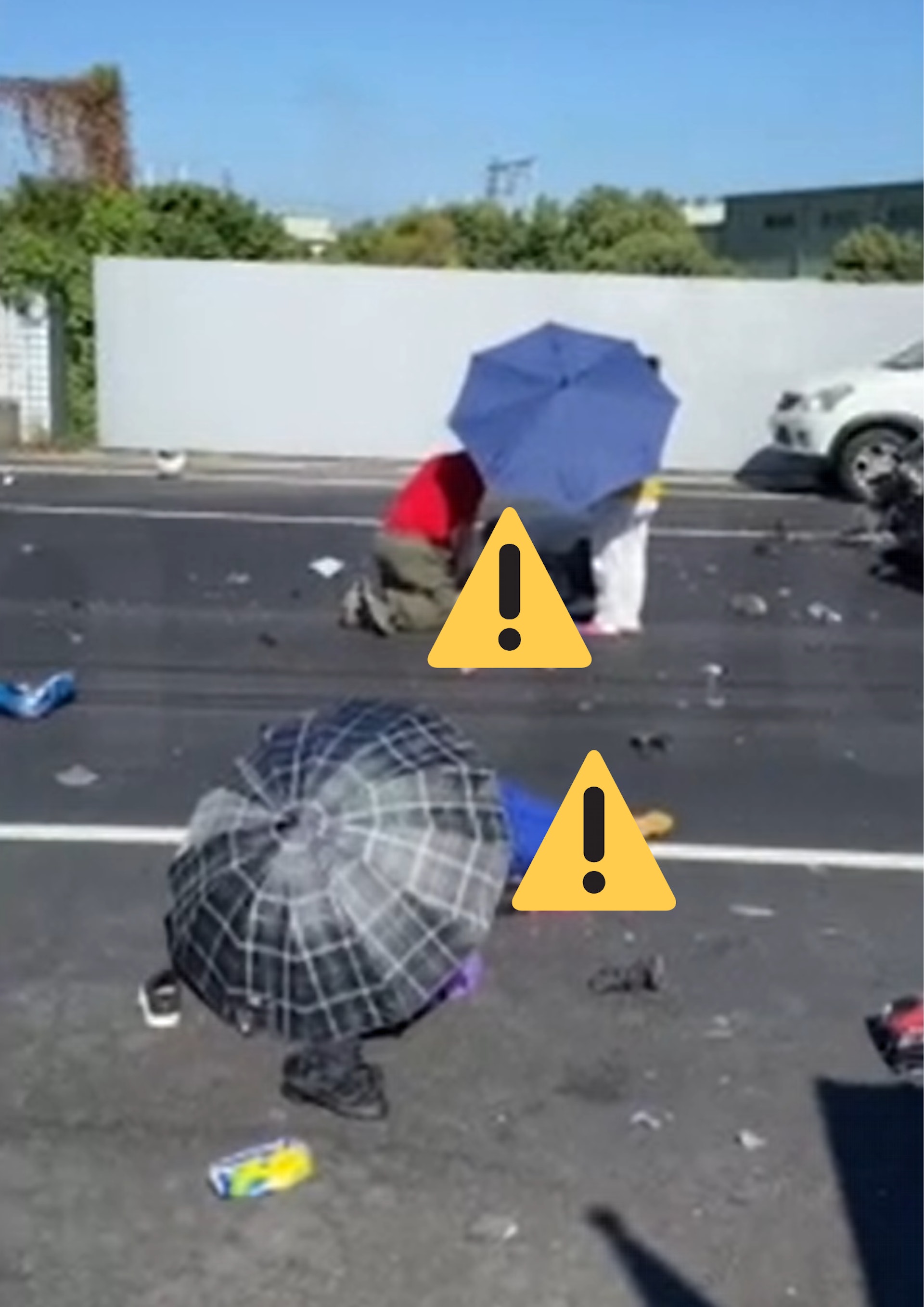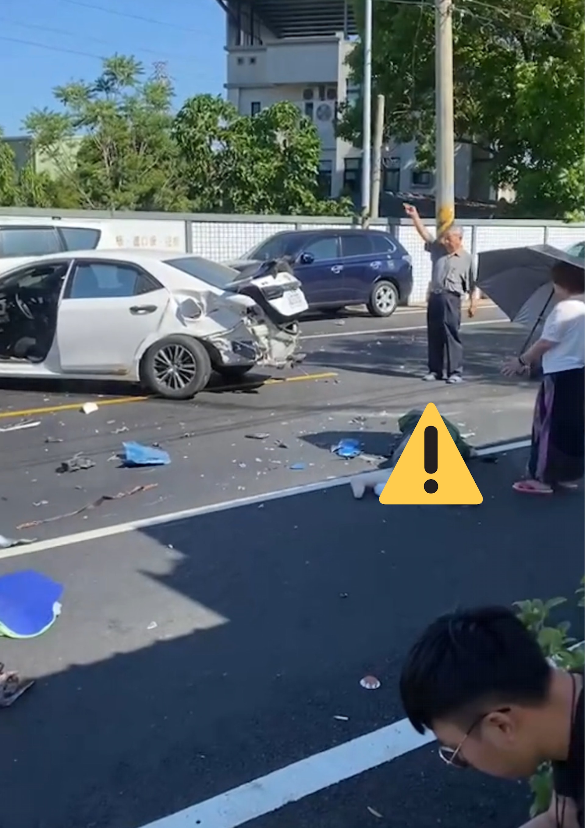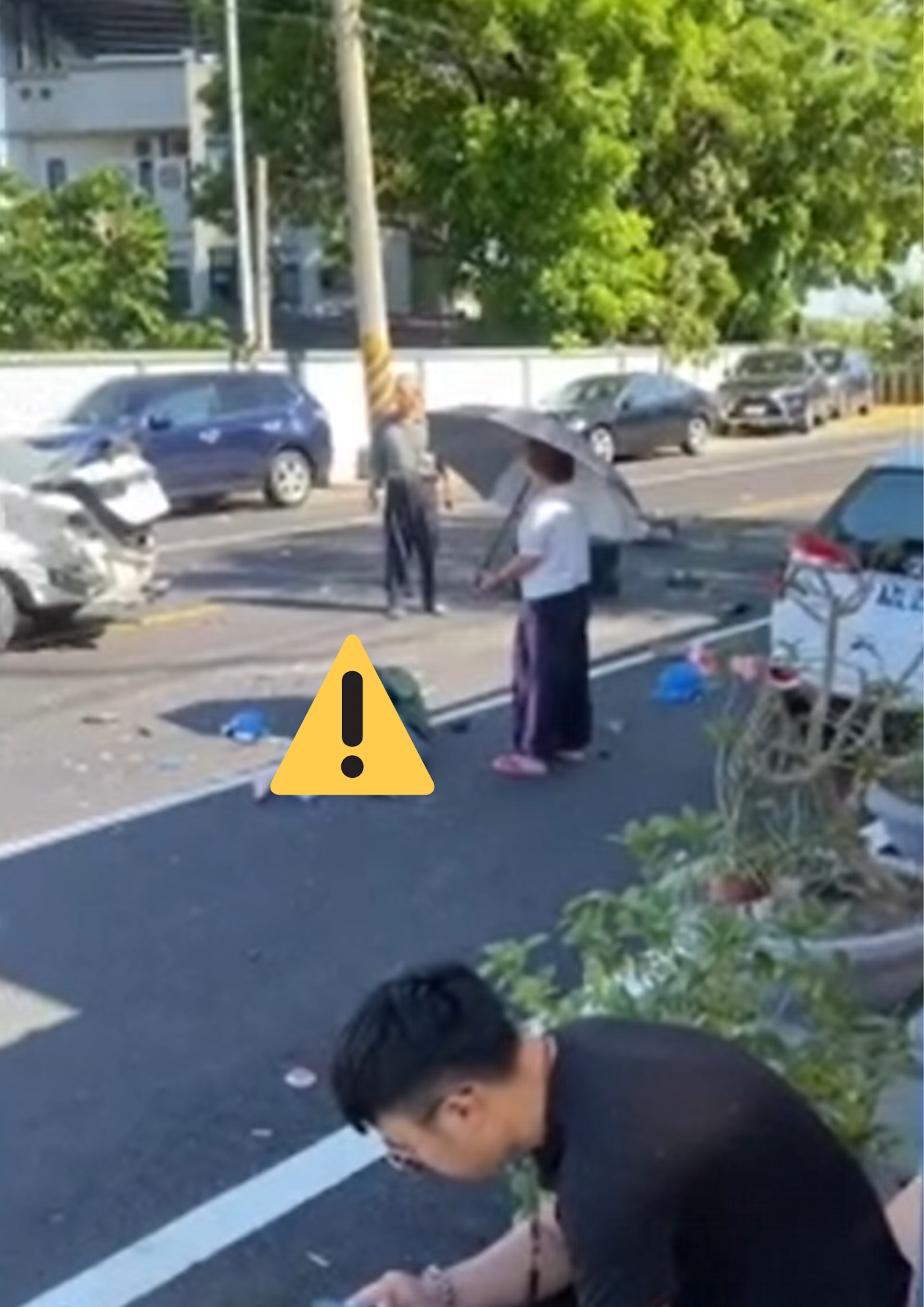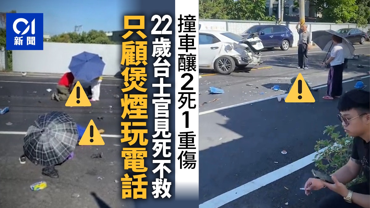 , x9 Z- Z9 X6 L& N$ I' m6 n# J台灣陸軍裝甲564旅陳姓下士,昨天(6日)上午8時37分許,駕車行經高雄岡山區大莊路不慎打滑撞對向私家車,後又撞飛2輛電單車,造成2死1重傷慘劇;事發當下影片曝光,只見3名婦人當時重傷躺在熱柏油路面,附近民眾幫忙撐傘、喊加油,盼她們撐下去,但肇事的陳男卻蹲在地上抽煙、滑手機,畫面讓人看了忍不住拳頭都硬了。tvb now,tvbnow,bttvb2 h: C1 B* k& B! n& g# p
