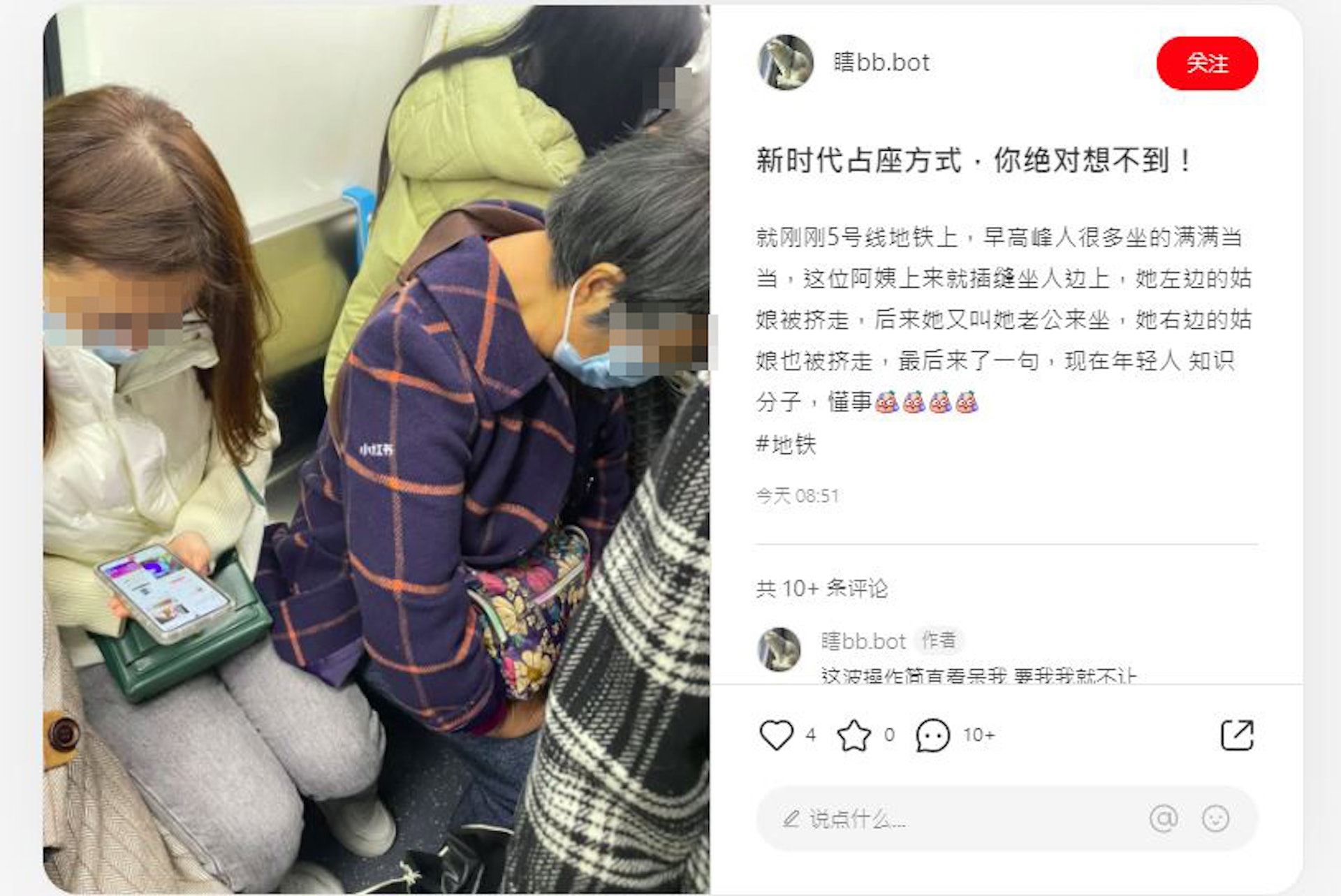 該內地女於小紅書以「新時代佔座方式,你絕對想不到!」為題發文,指周三(3月1日)早上乘坐5號線地鐵,由於是人流高峰,「很多坐的滿滿當當」,然而有位「阿姨」一上車就「插縫坐人邊上」,把其左邊的女子擠走;得手後「阿姨」再叫其丈來坐下,把右邊的女子也擠走,掃除了左右「障礙」。公仔箱論壇& w- v3 C5 K" _. j