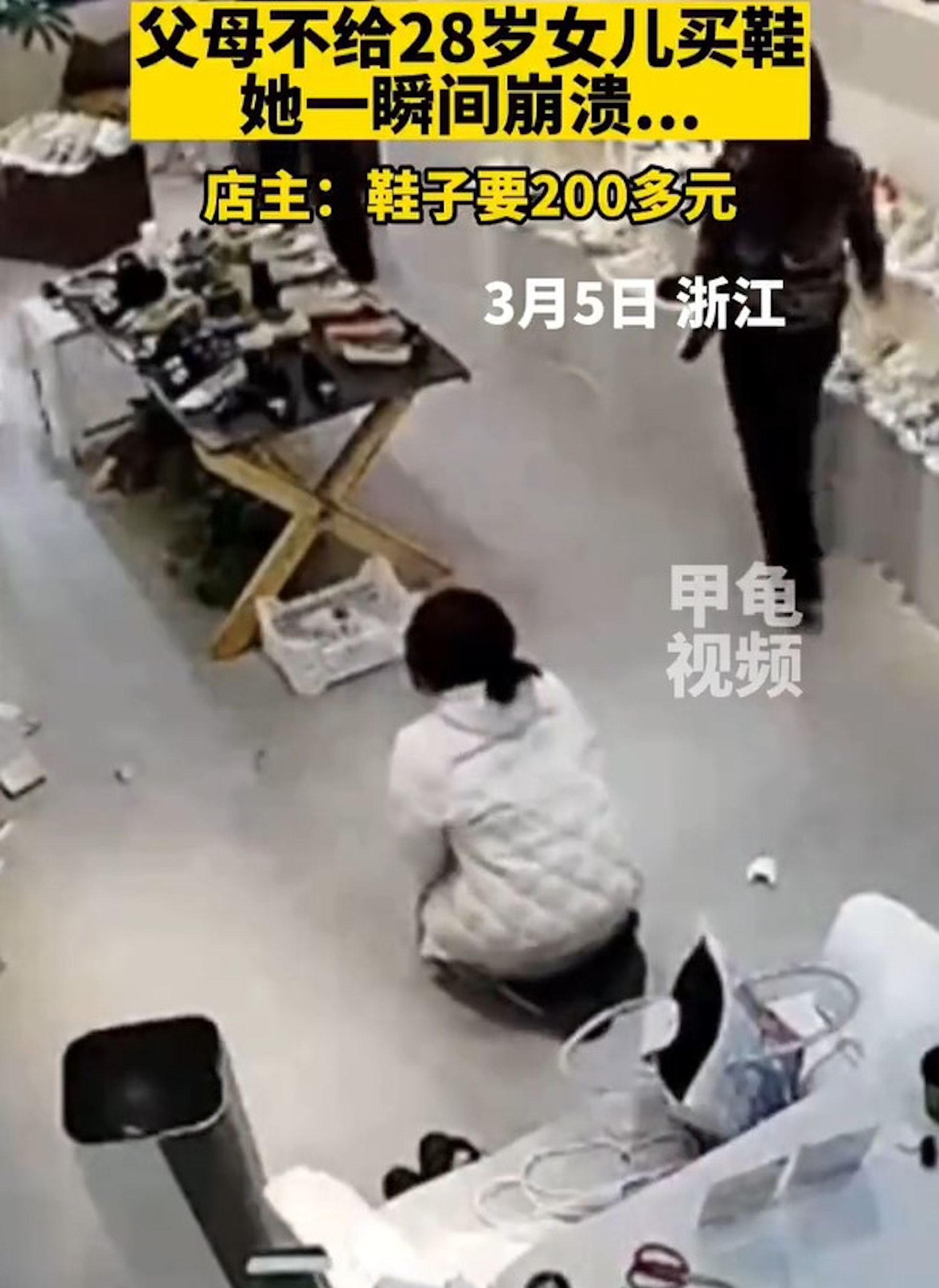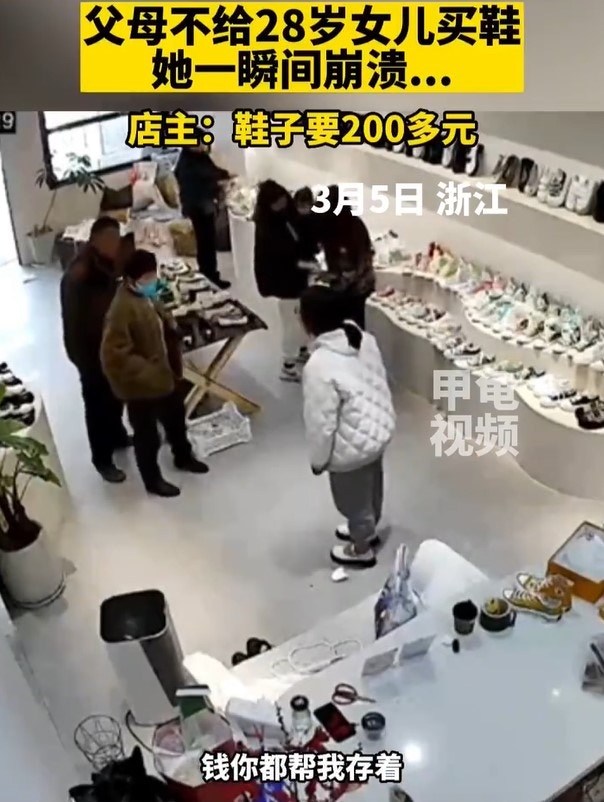 3 S3 x9 v% r' i7 s/ T內媒報道,浙江有名28歲女生近日和父母逛街時走進某一鞋店,看中了一雙200多元人民幣(約230港元)的鞋子,便要求父母付款,旁人都以為她是「啃老族」。父母表明不同意,覺得鞋子不需要買太貴,稱「我們穿的不也是幾十塊錢嗎?」,她便坐在地上大哭,甚至跪地磕頭,場面很是尷尬。