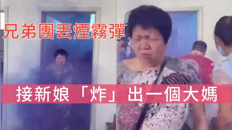 $ _; a3 Q* U+ M( G. R中國婚嫁習俗多,接新娘玩新郎是傳統習俗之一。不過,近日河北石家莊,有迎親兄弟懶得討價還價,直接向房內扔進小型煙霧彈,房裡的人登時被熏得淚流滿面,紛紛走出房間,一位「大媽」更率先帶頭走出,唯獨新娘因沒有穿鞋而被迫留在房內。網民紛逗笑「炸」出了一位大媽來。TVBNOW 含有熱門話題,最新最快電視,軟體,遊戲,電影,動漫及日常生活及興趣交流等資訊。7 x; S8 l; i: n5 w